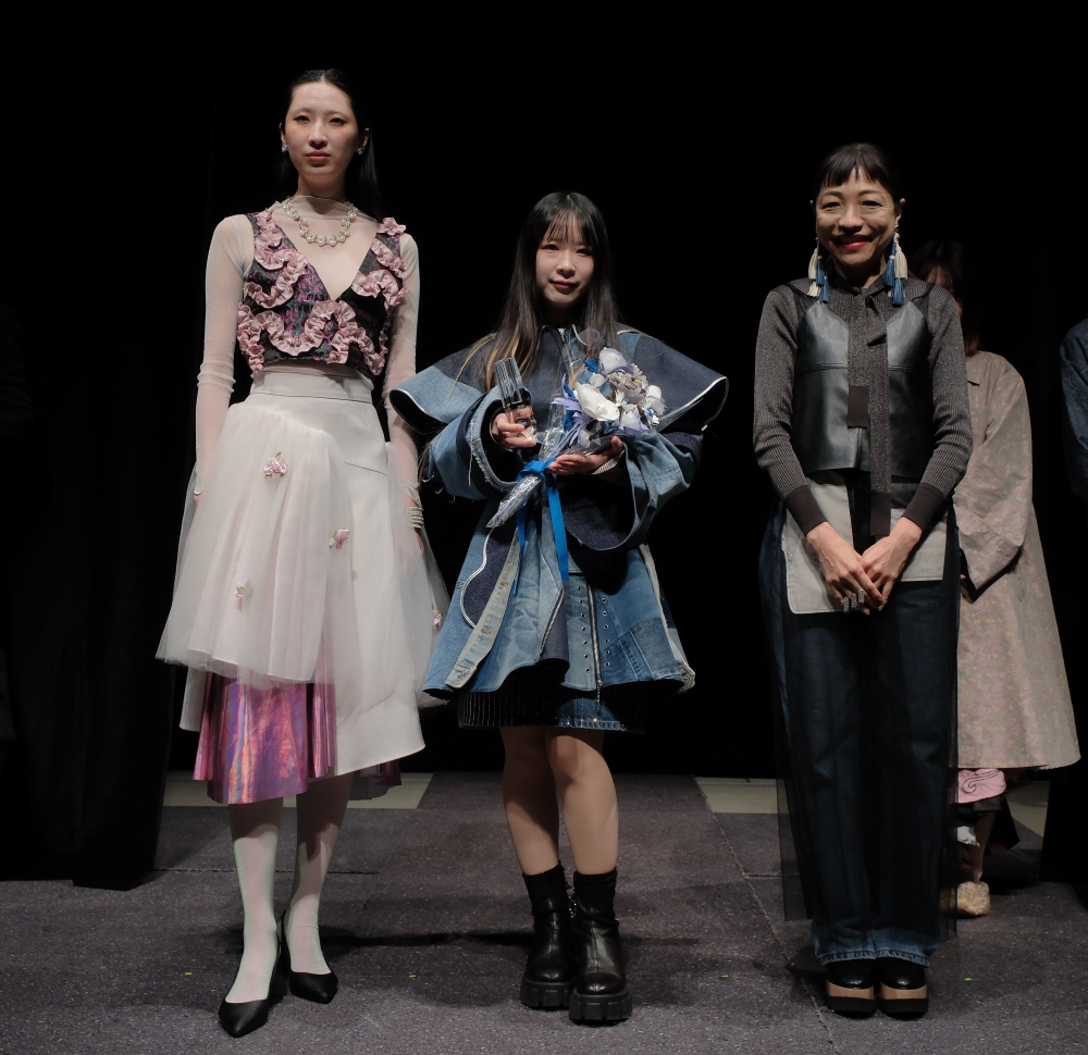 「日常にときめきを纏う服」をテーマに、思い出の詰まった古着の魅力を活かした作品を発表しました。華やかさと日常性のバランスを取りながら、元の形や素材の魅力を尊重したデザインが印象的です。セレモニーで着用されていた素材をメインに使用。出番が限られがちな服を、日常でも楽しめる「大人かわいい」デザインへと昇華しています。幼少期に着ていたサイズアウトした服や、仕事で着用していたユニフォームなど、異なる背景を持つ服を再構築。華やかさを残しながら、日常に取り入れやすいスタイルへと落とし込みました。セレモニーと日常を横断するスタイル提案に、着る楽しさと新たな価値が表現されていました。