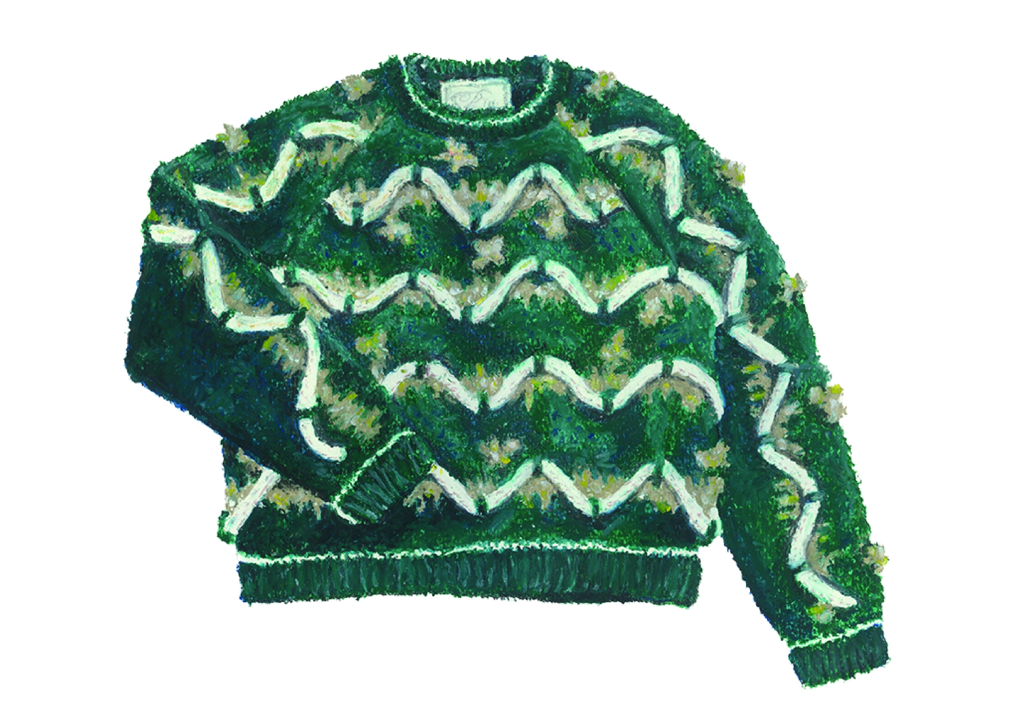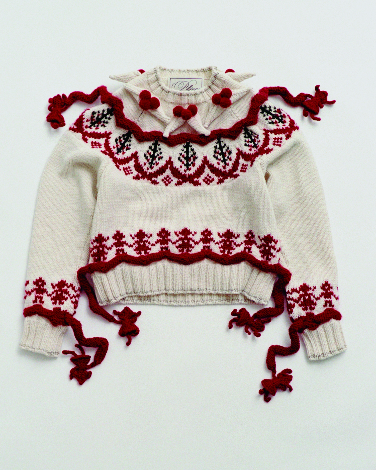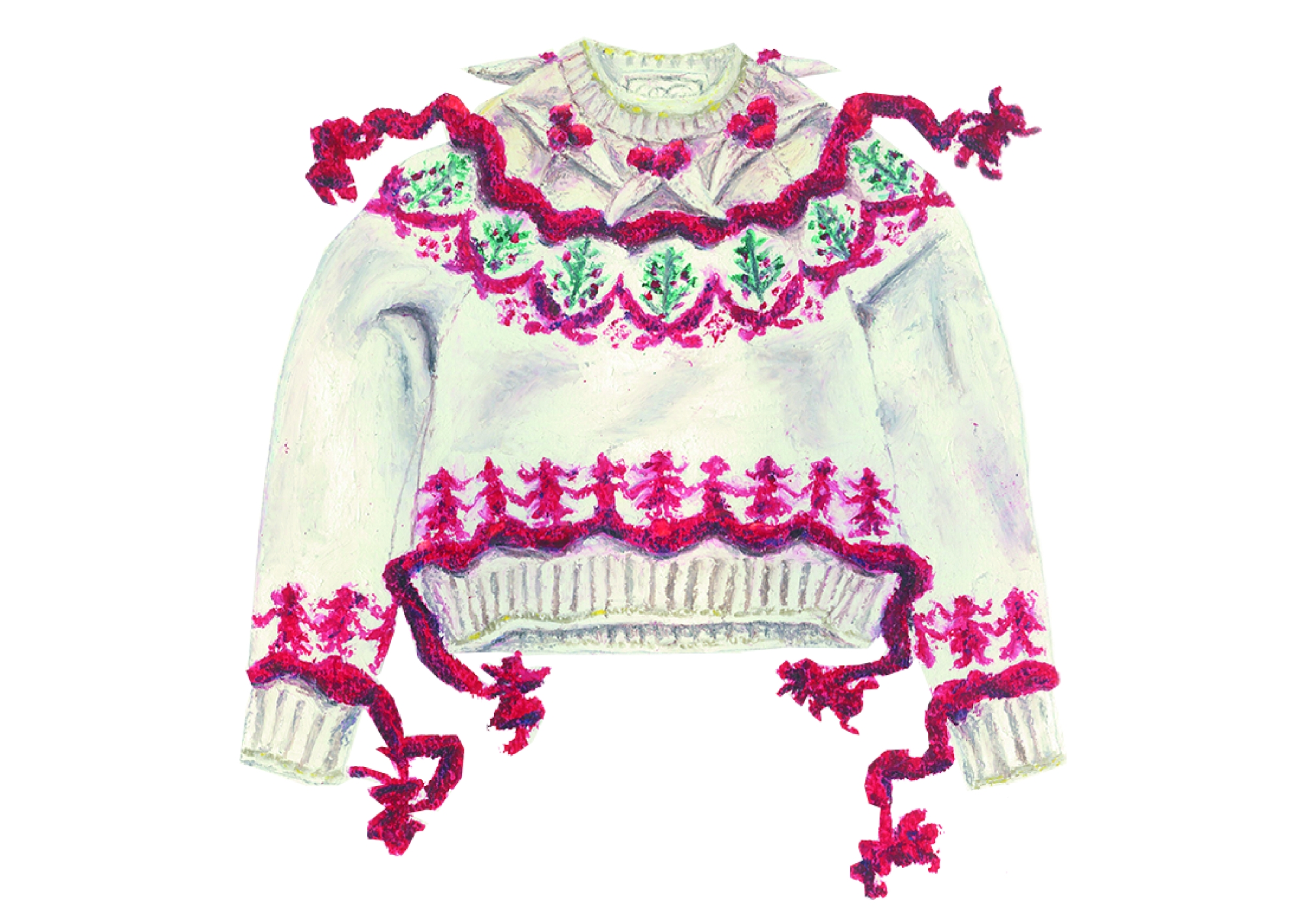 目を引くのは、クリスマスらしい赤が映えるドワーフセーター。小人の妖精「クリスマスドワーフ」のモチーフがあしらわれました。