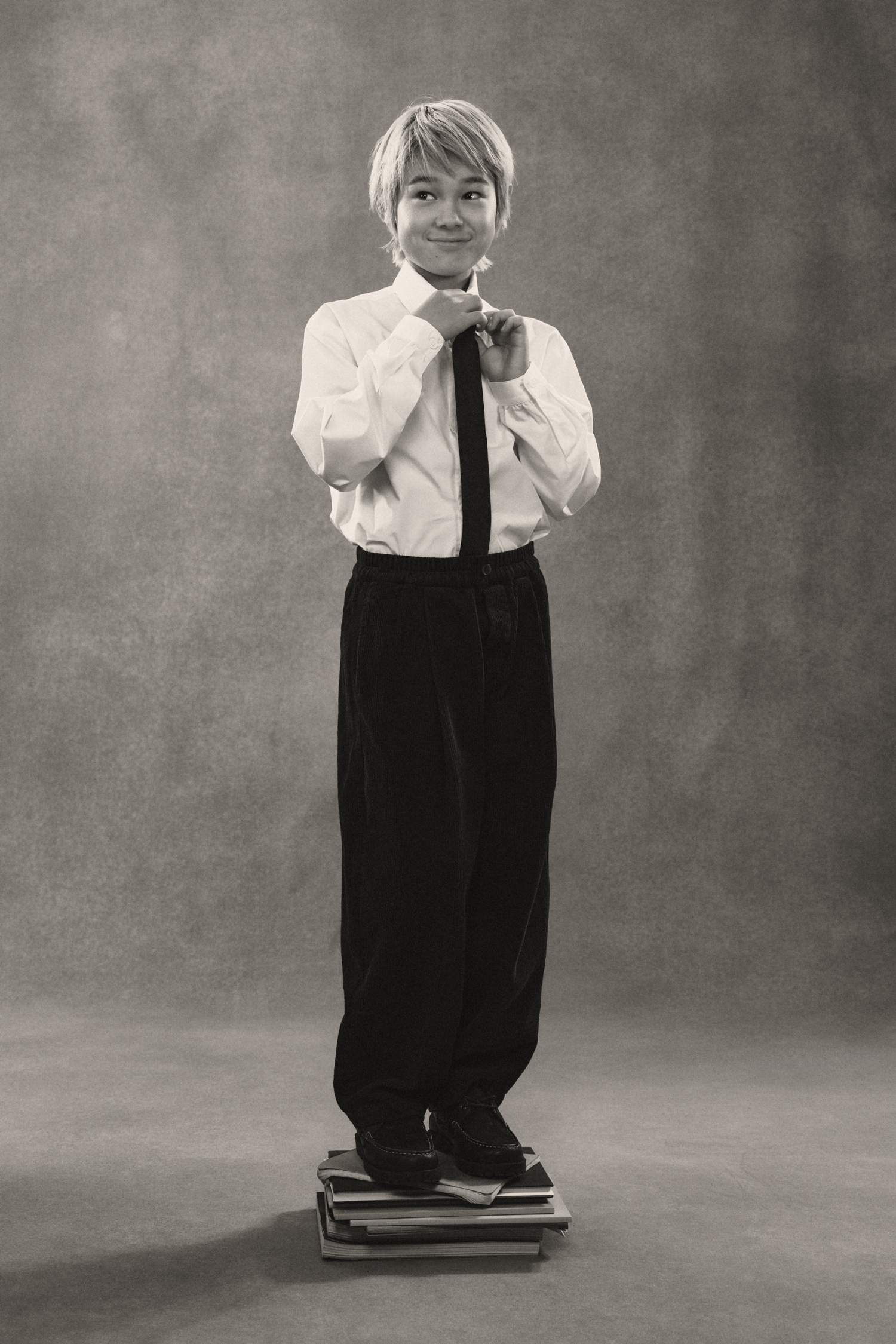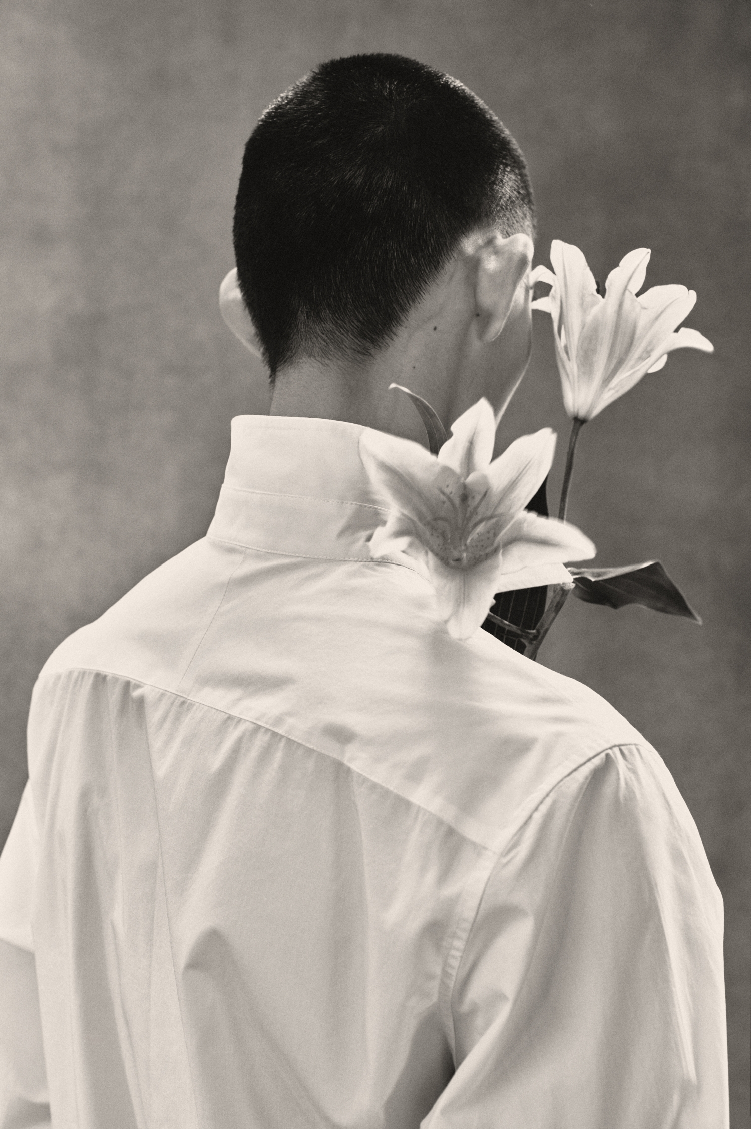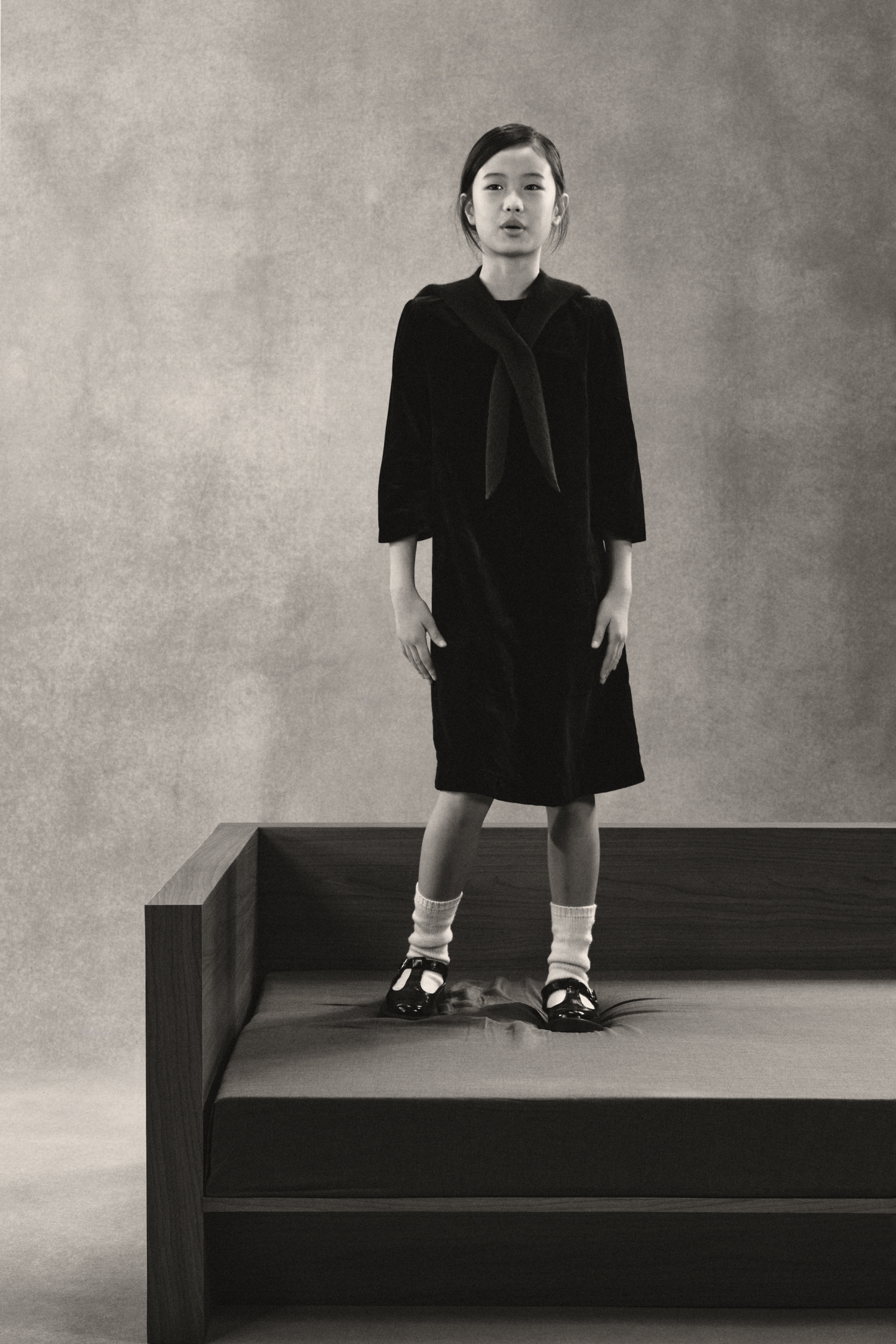 ウィメンズラインでは、流れるようなシルエットや柔らかなプロポーションでテーラリングを再解釈し、ノスタルジックでありながらモダンな色彩を取り入れています。メンズラインは構造性とリラックス感が絶妙に調和し、洗練されたカットや計算されたドレープによって、フォーマル素材に新たなアプローチを加えています。キッズラインは親密さにフォーカスし、大月氏が幼少期に母親から手づくりしてもらった洋服の記憶を想起させる温かみのある仕上がりです。