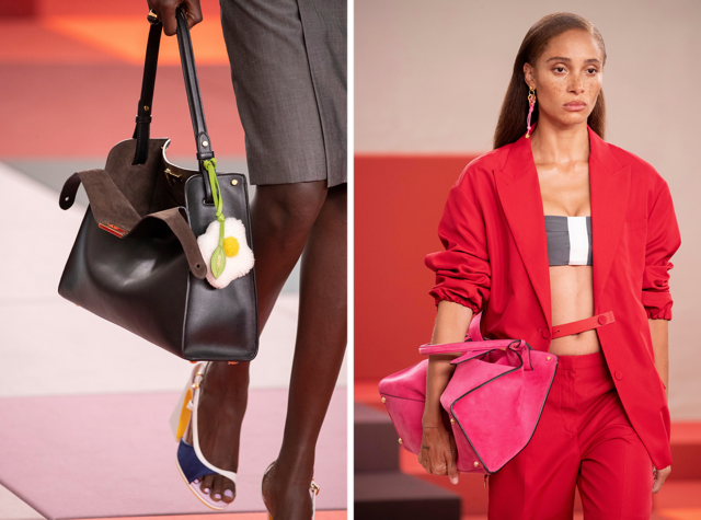 ハンドル脇のフックにはチャームやアクセサリーを取り付けることができます。バッグを開けたまま持ったり、抱えるように携えたりと、従来の枠にとらわれない持ち方の提案も印象的です。