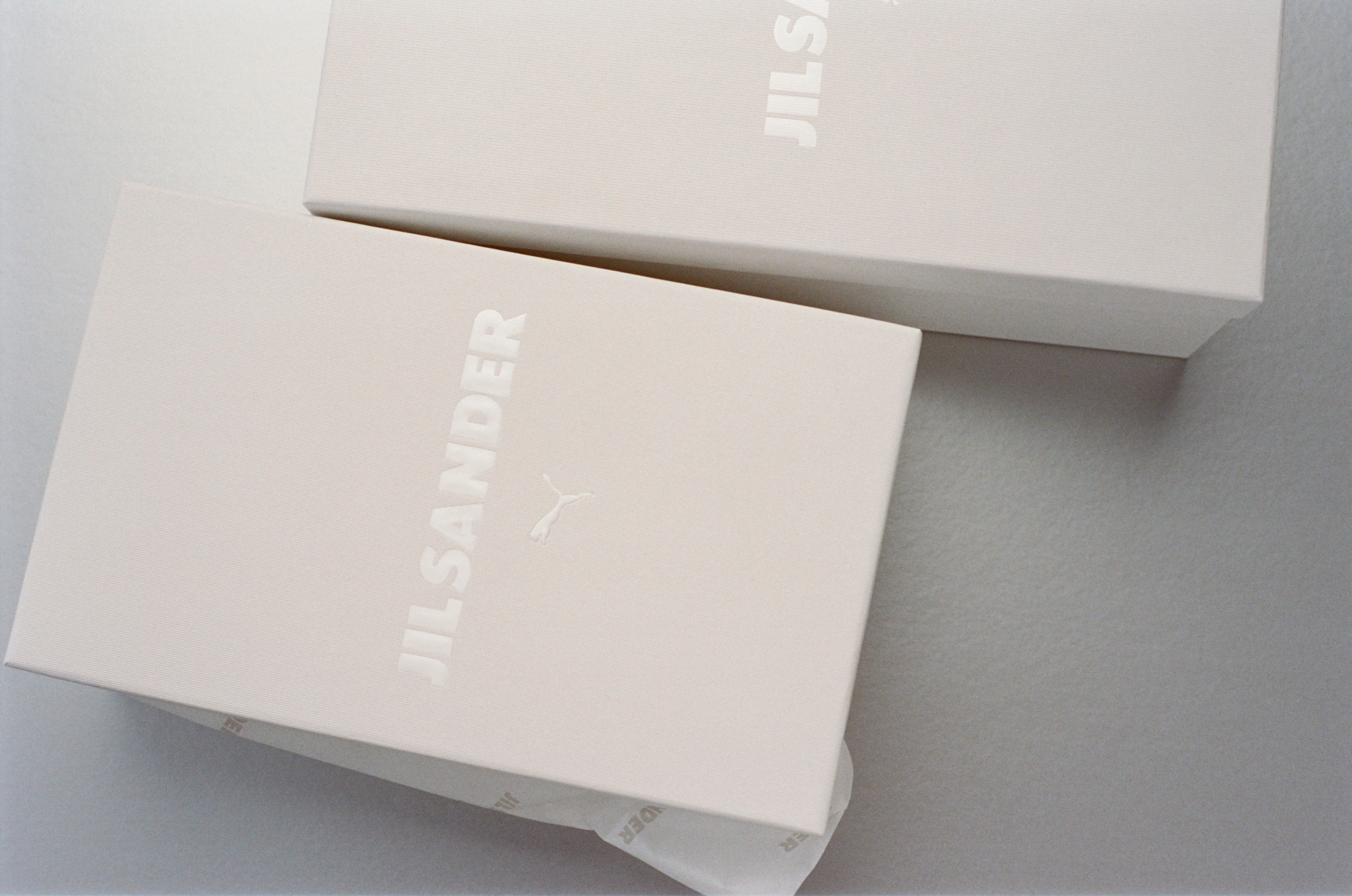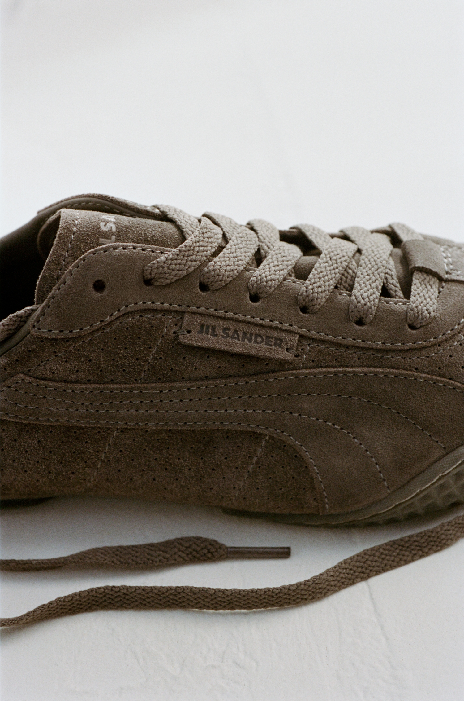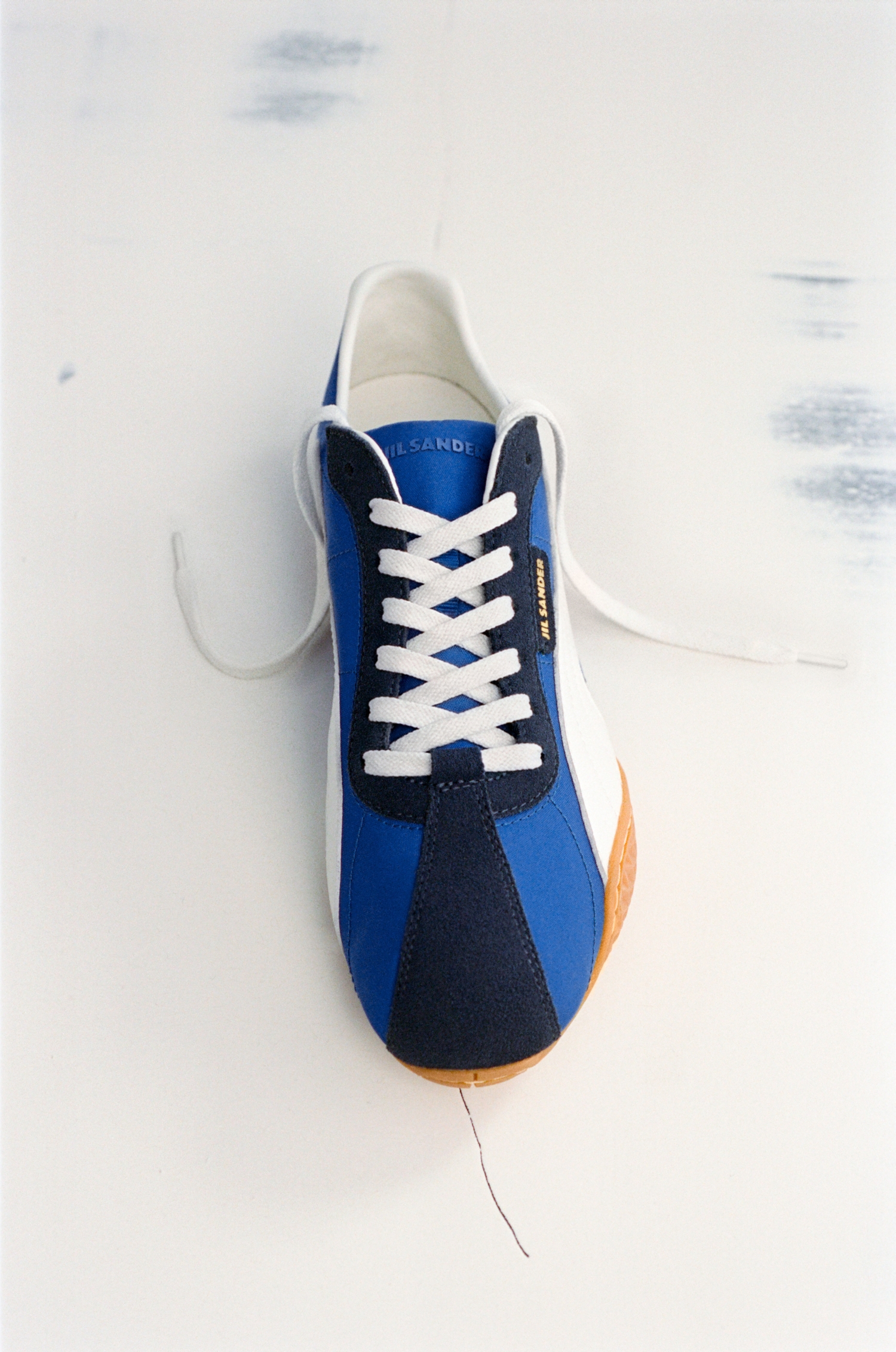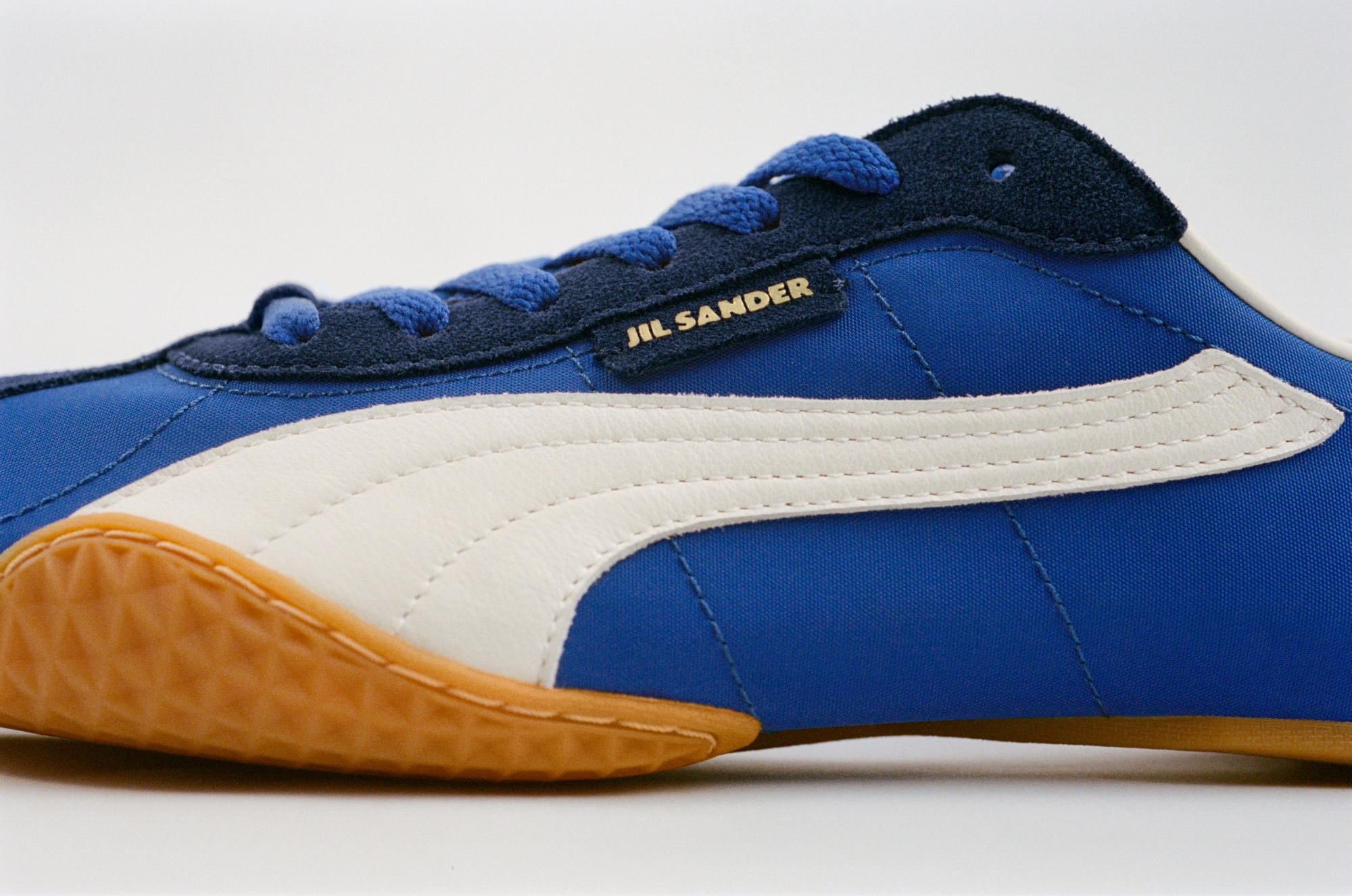 素材は2種類、カラーは3色が用意されました。落ち着いたブロンズトーンのパンチングスエード、ベージュのキャンバス、コントラストの効いたスエードディテールを配したエレクトリックブルーのナイロンの3種類。JIL SANDERのブランディングに加え、ヒールにはプーマのキャットロゴを配しています。