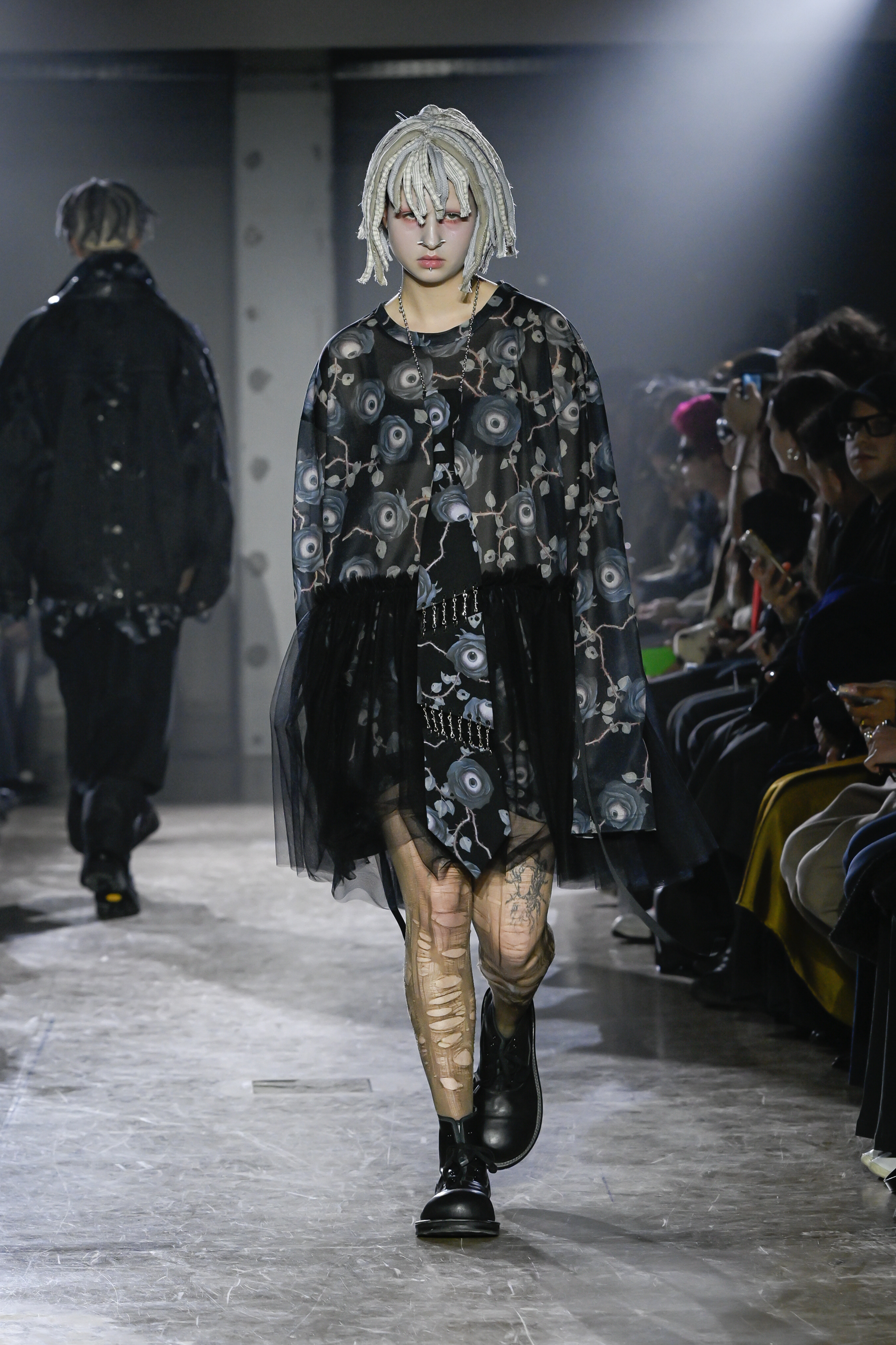 コレクションの軸にあるのは、KIDILLらしいパンクの精神と、「相反するもの」を受け入れる視点です。かわいらしさとハードさ、静けさと激しさといった対照的な要素が共存し、緊張感のある美しさを生み出しています。