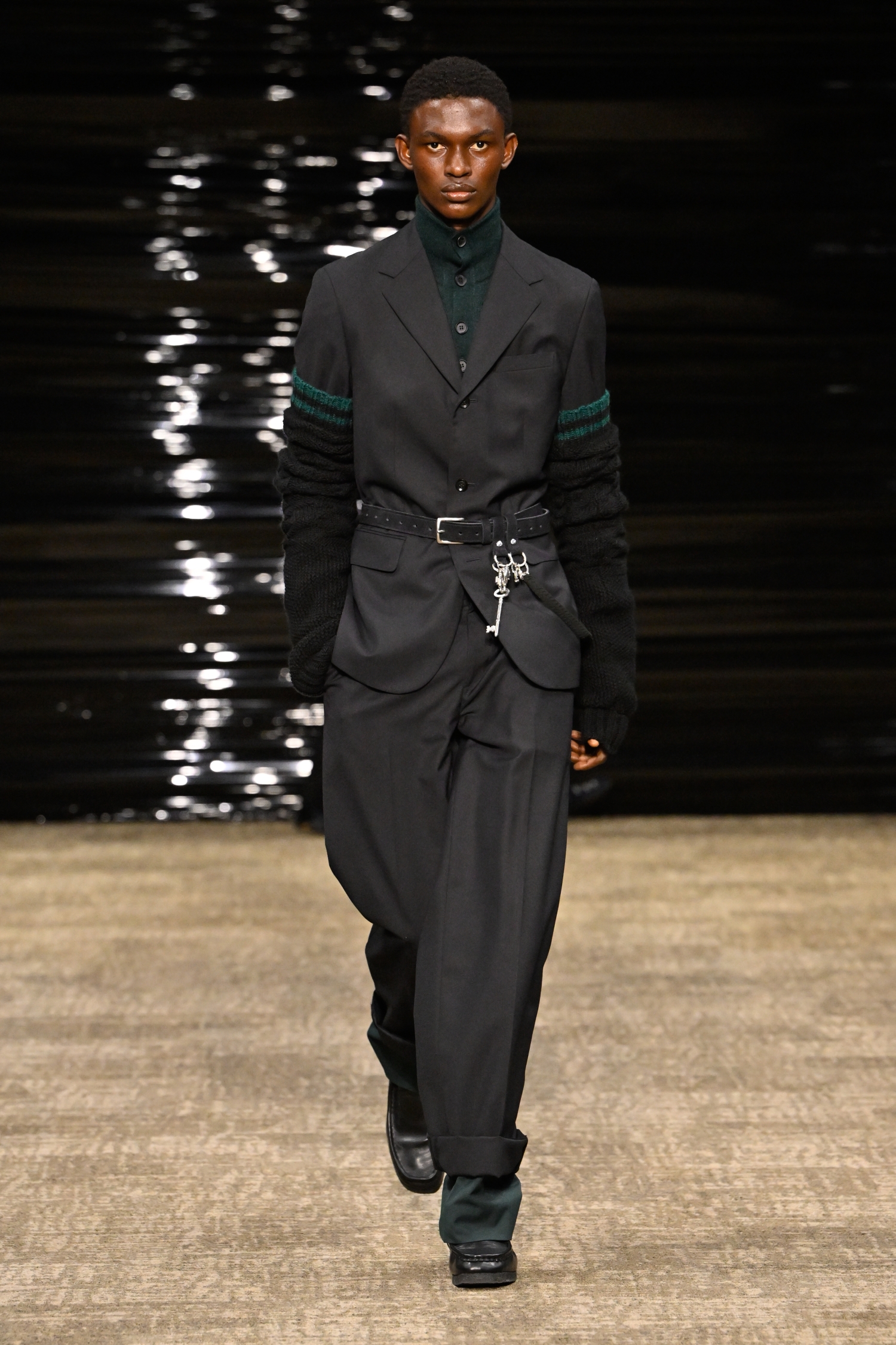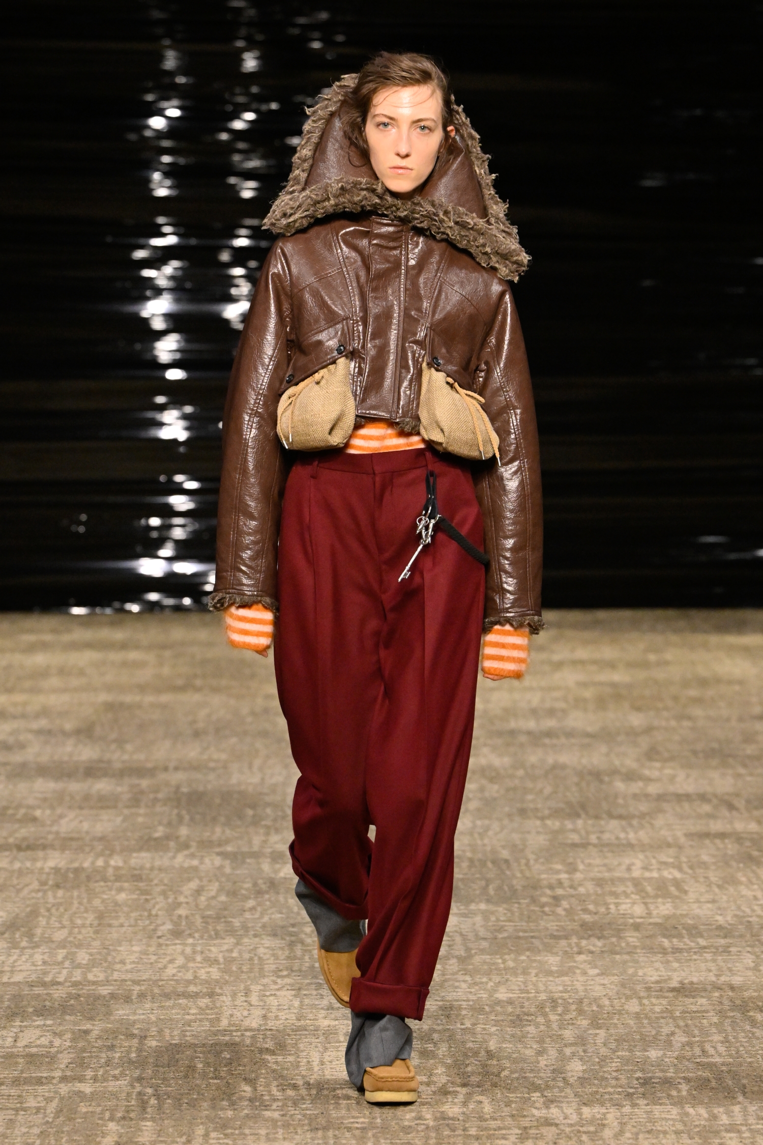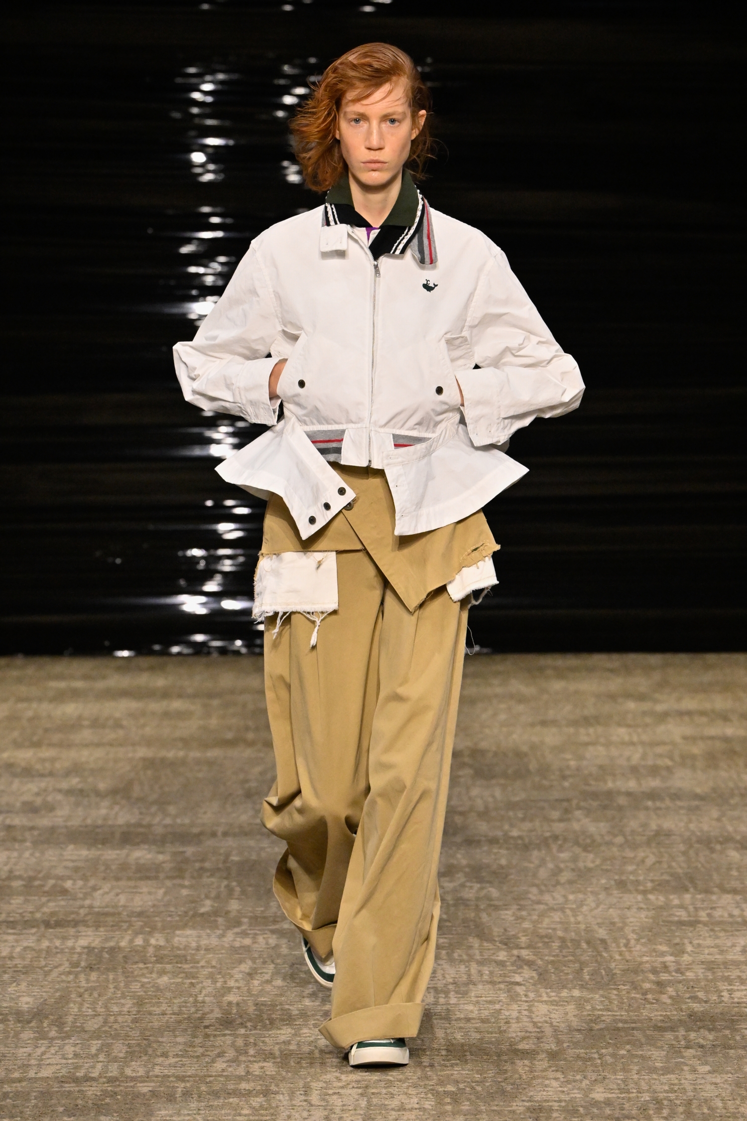 シルエットはオーバーサイズを基調としながらも、コートやジャケットには重心のずれや非対称なバランスを取り入れ、波に揺さぶられるような不安定さを印象づけました。シャツやニットは、インナーとしてのぞかせたり、異素材と重ねたりすることによって、ラフでありながら緊張感のあるスタイリングを生み出しています。