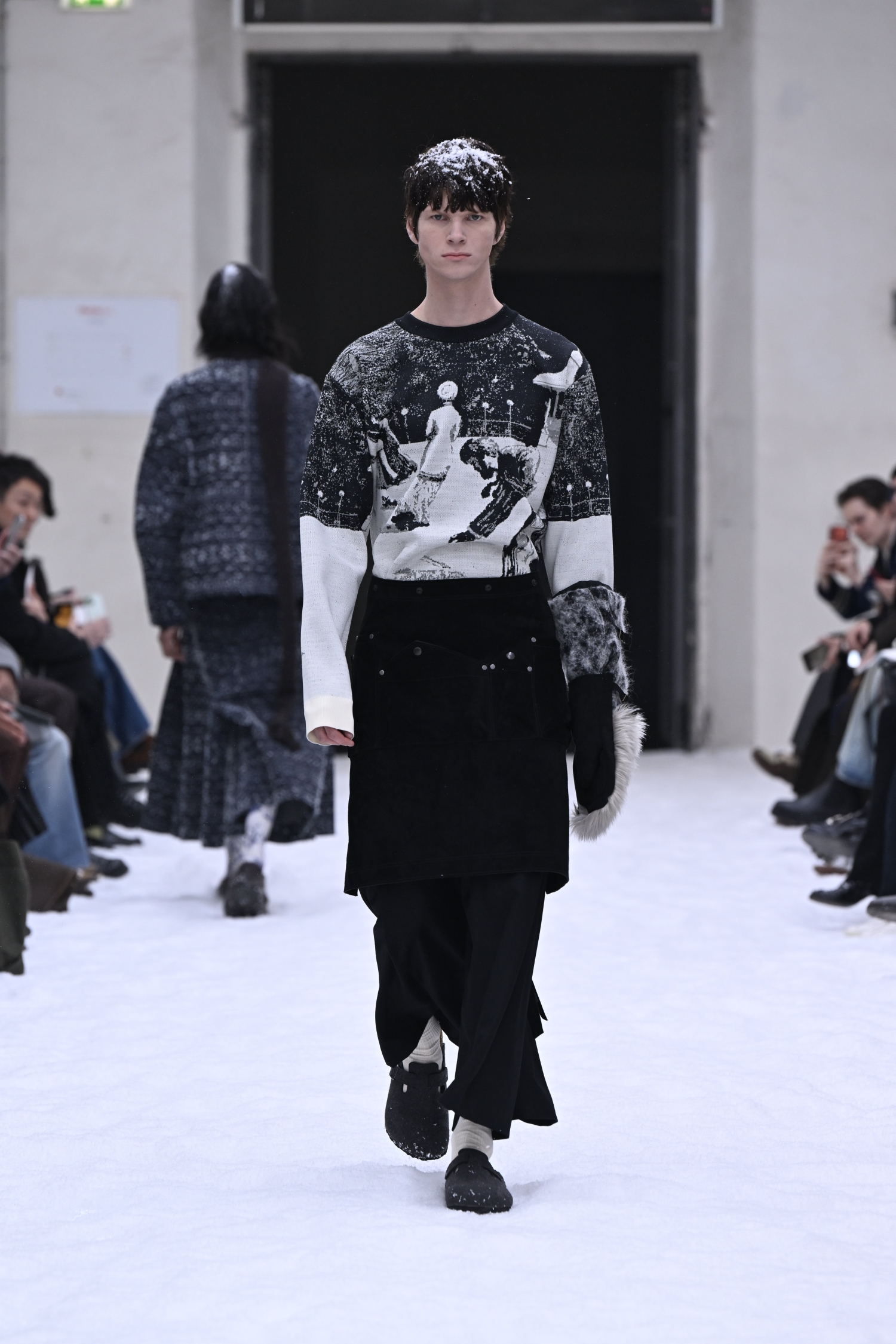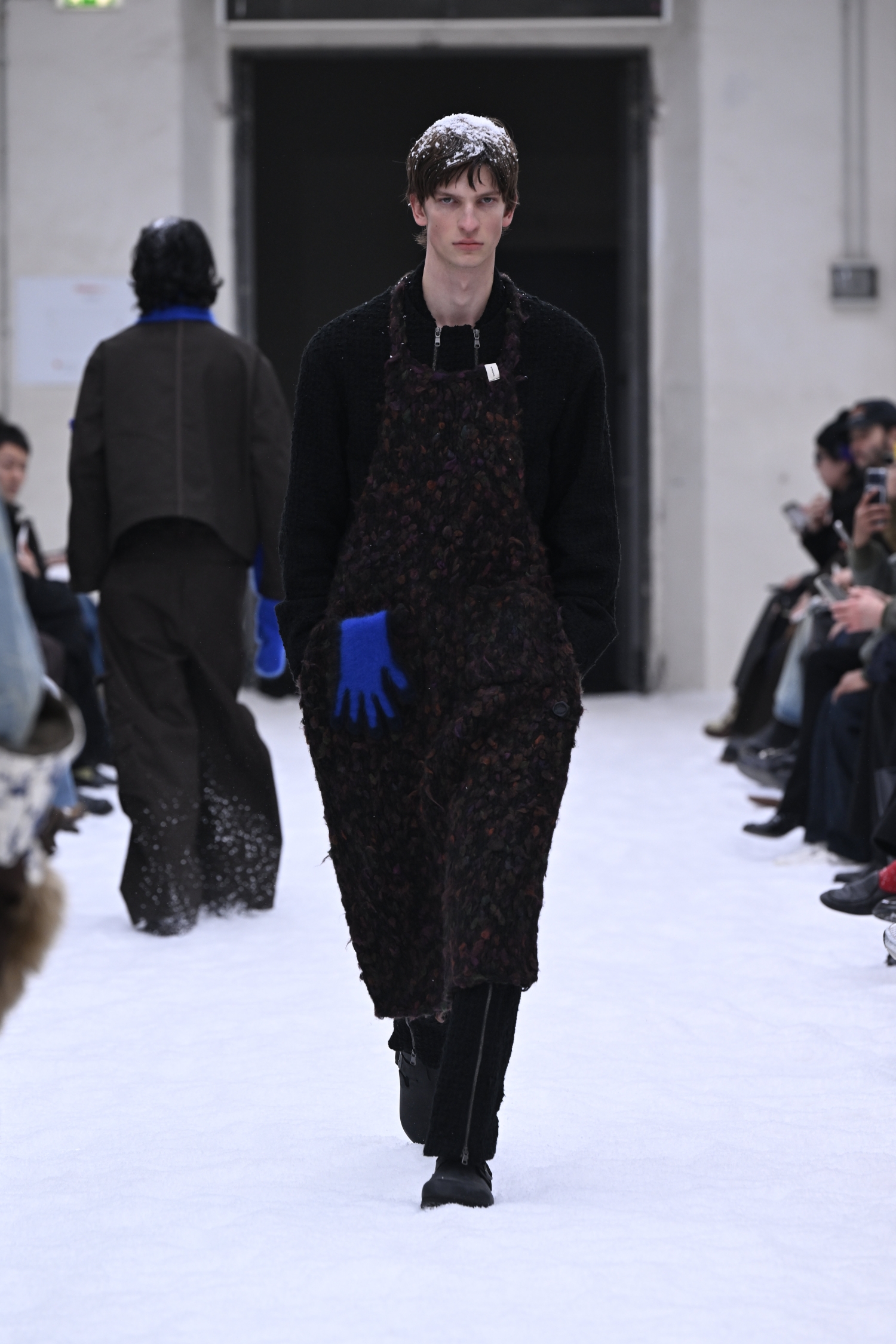 ニードルパンチ加工でモノクロームの雪景色を描きました。静まり返った冬の風景を思わせるテクスチャーは、どこかノスタルジックで、柔らかな空気をまといます。ワークウエアの要素も取り入れながら、無骨さをそのまま表すのではなく、ぬくもりや癒やしを感じさせるムードへと昇華していました。