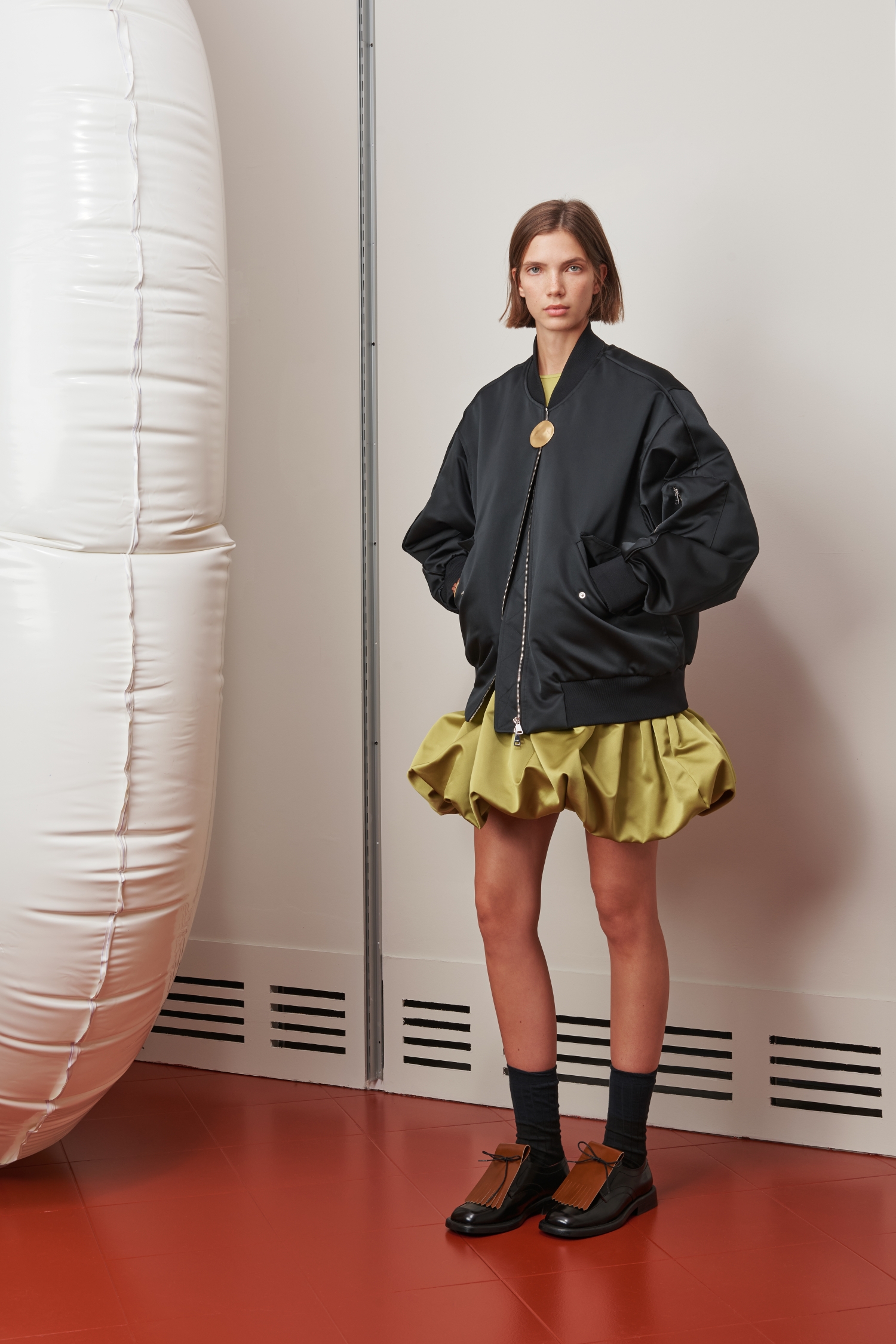 「コントラスト」をテーマに選んで、マスキュリンとフェミニンのコードが共存するワードローブを提案しました。ユーティリティとクチュール、機能性と彫刻的表現を掛け合わせた構成が特徴です。