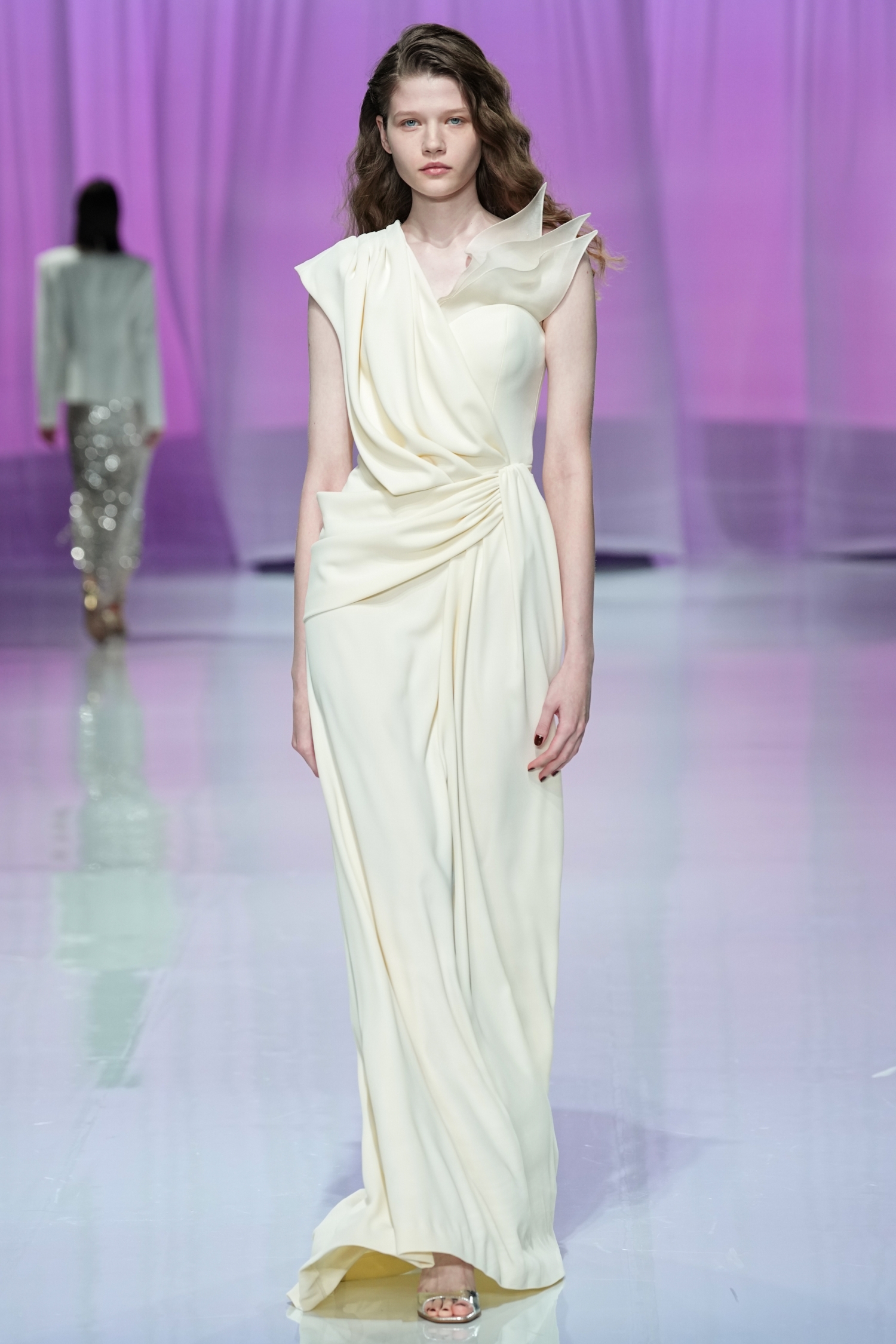 風に揺れながらも確かな力を秘めた、見えないエネルギーを、光のようにしなやかで透明感のあるスタイルで表現しました。軽やかさを新たな強さとして捉え、優しさと意志を併せ持つ女性像を描いたコレクションです。