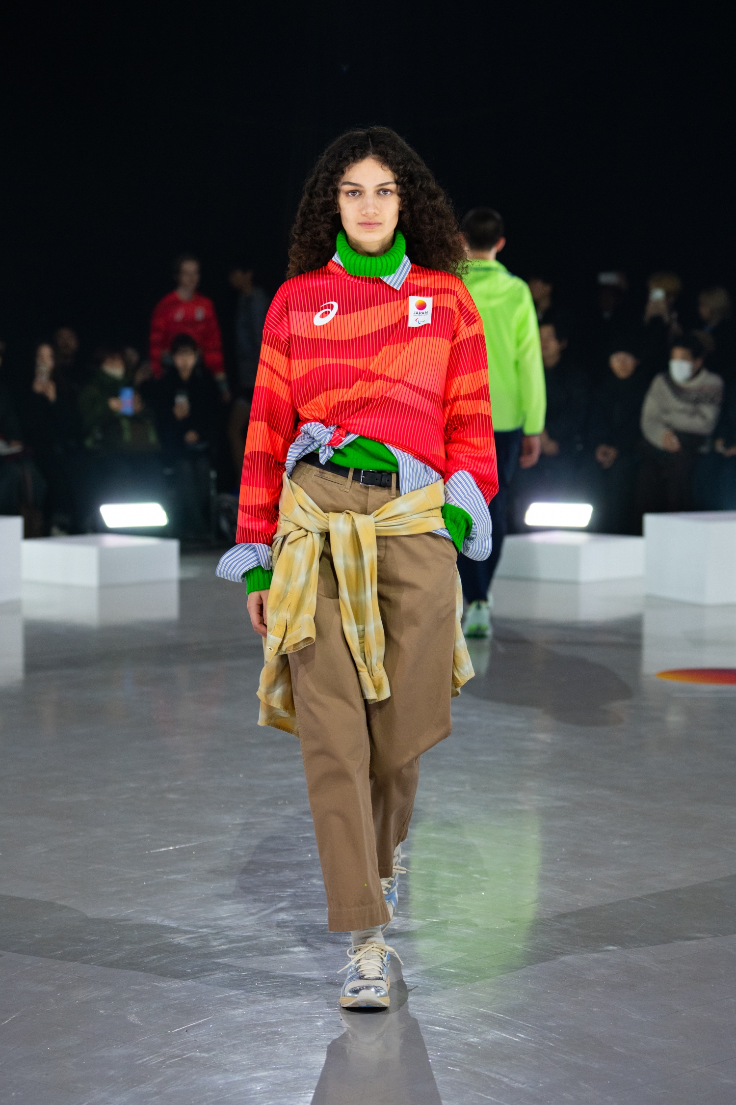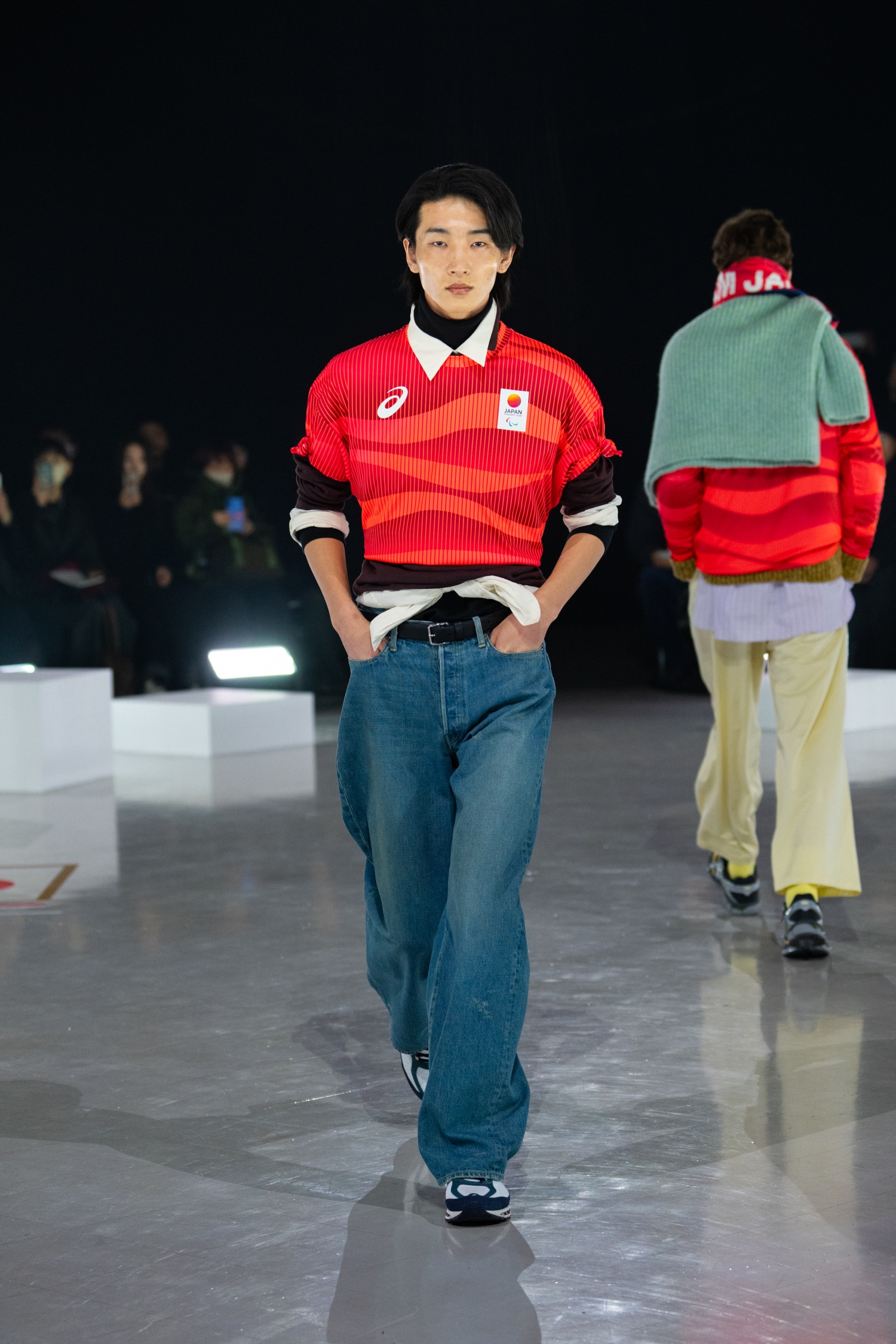 ランウェイにはASICS 2026年春夏インラインアパレルをはじめ、TEAM JAPANオフィシャルスポーツウェア、公式ライセンス商品が登場。カラフルなニットやシャツを重ねた、自由でプレイフルなレイヤードスタイルが披露されました。競技服という枠を超えた、日常にも取り入れやすいスポーティな装いです。アスリートが日々積み重ねてきたトレーニングの時間や、その背景にある静かな集中と高揚感を、ファッションとして表現しています。