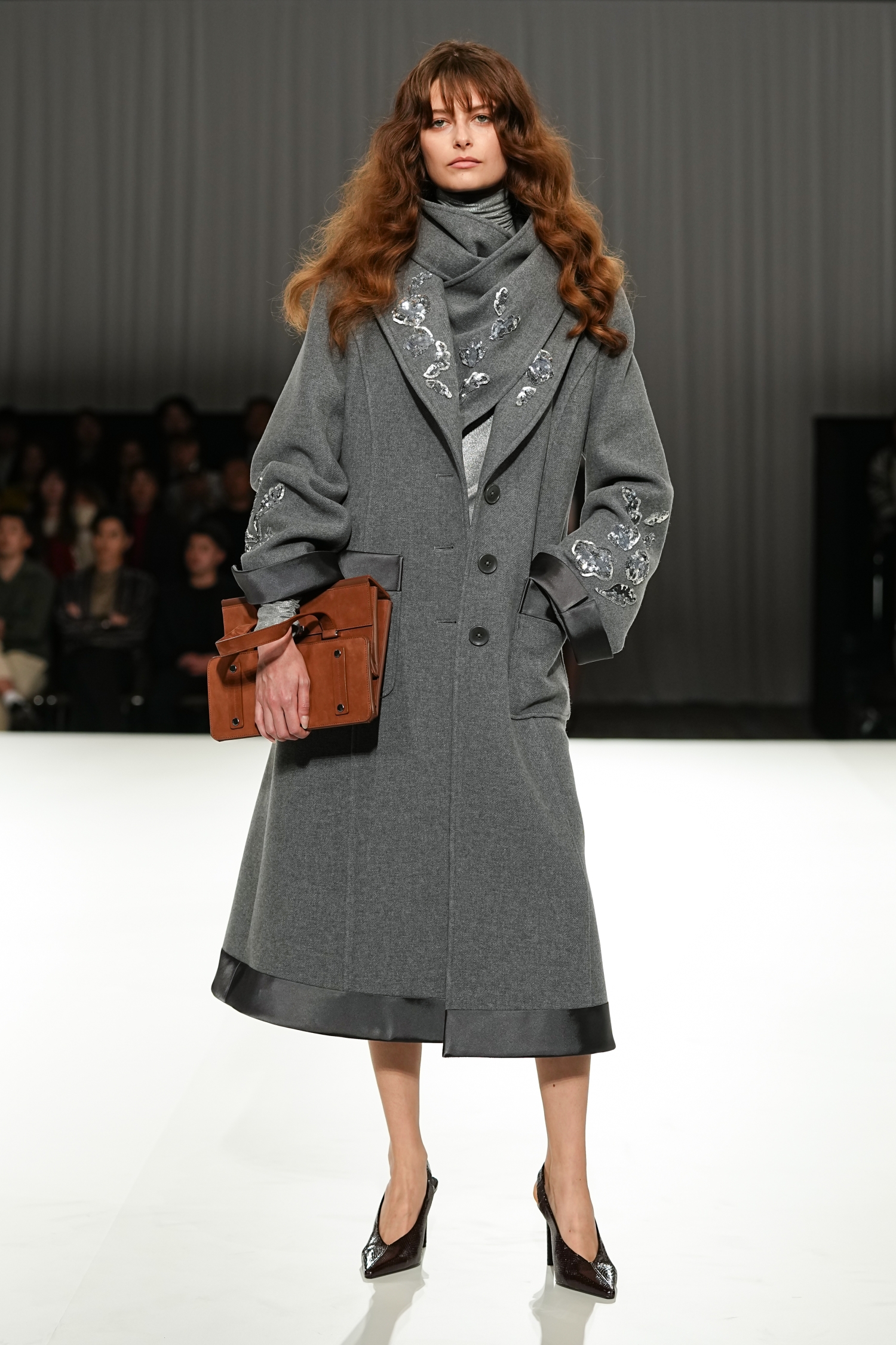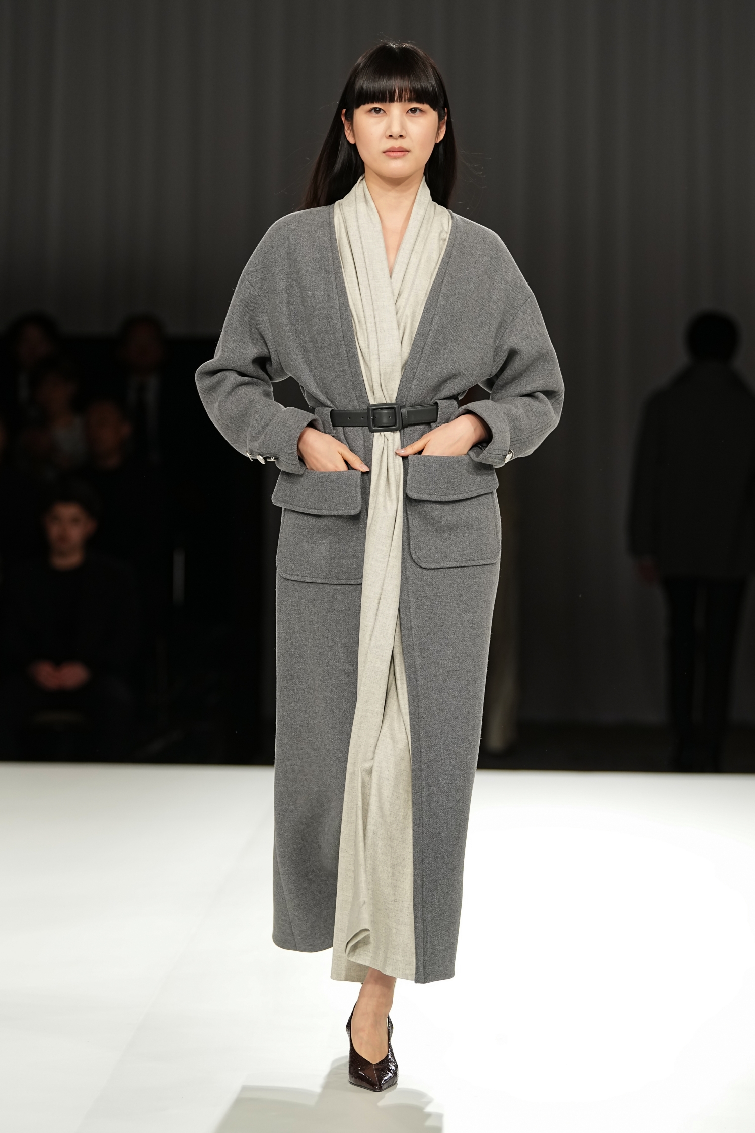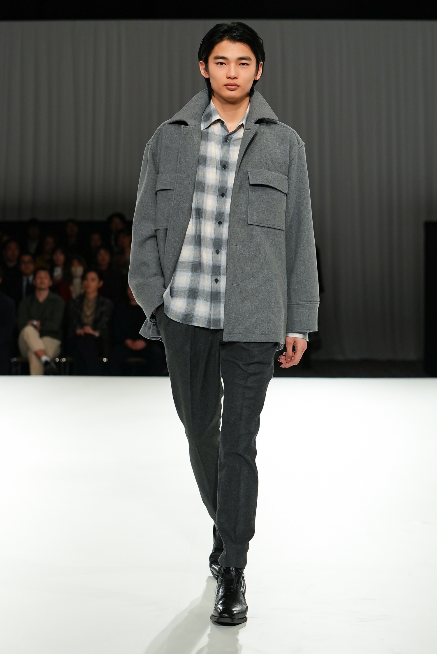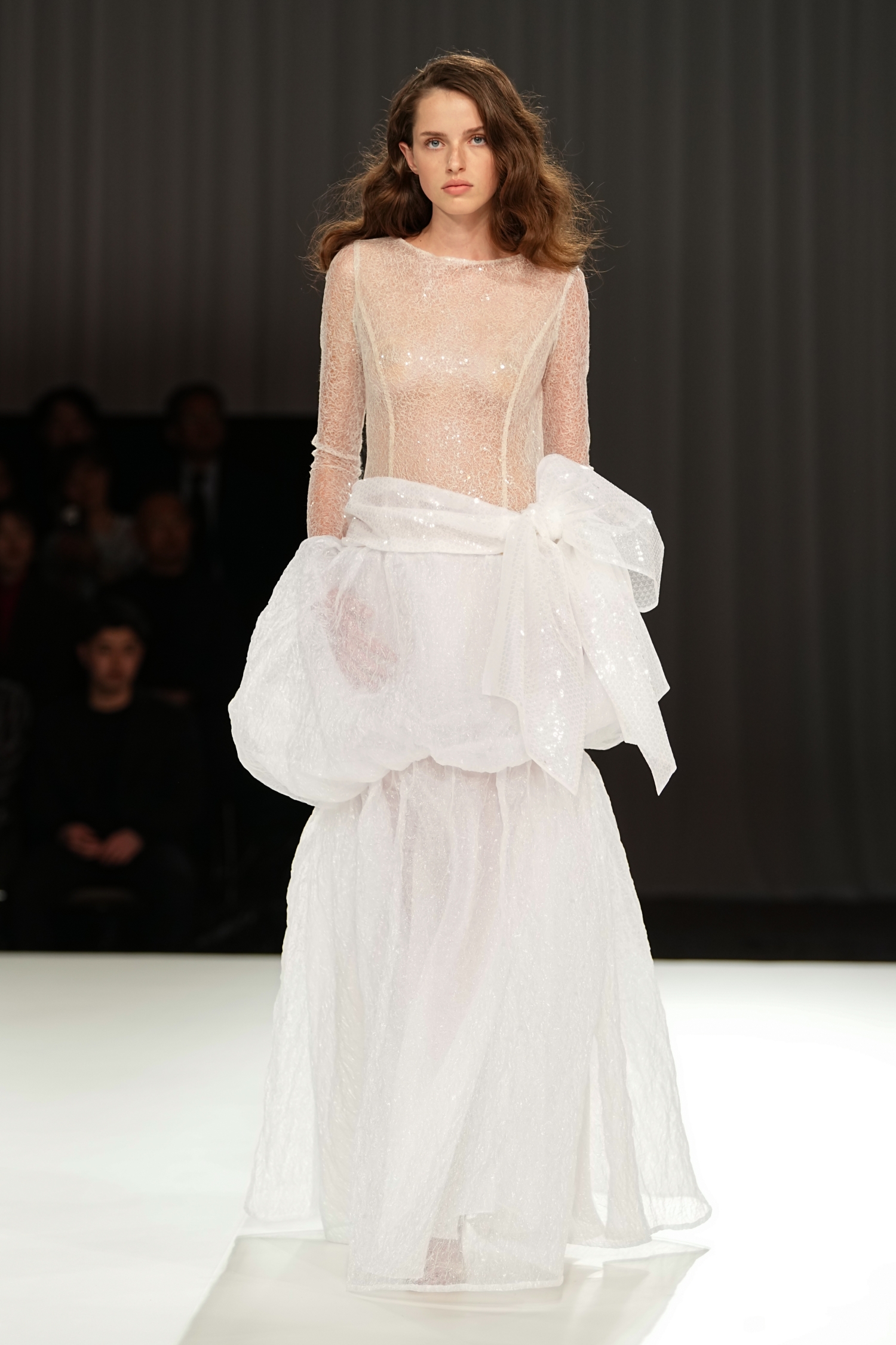 「愛」の多層性を、空間演出と素材の重なりやシルエットの対比によって表現しました。静かな始まりから徐々に緊張感を帯び、再び光へと向かう構成。抑制の効いた演出のなかで、服そのものの存在感が際立ちました。