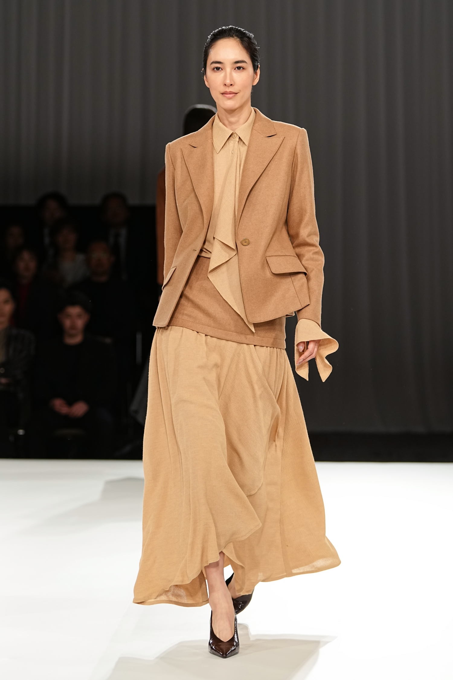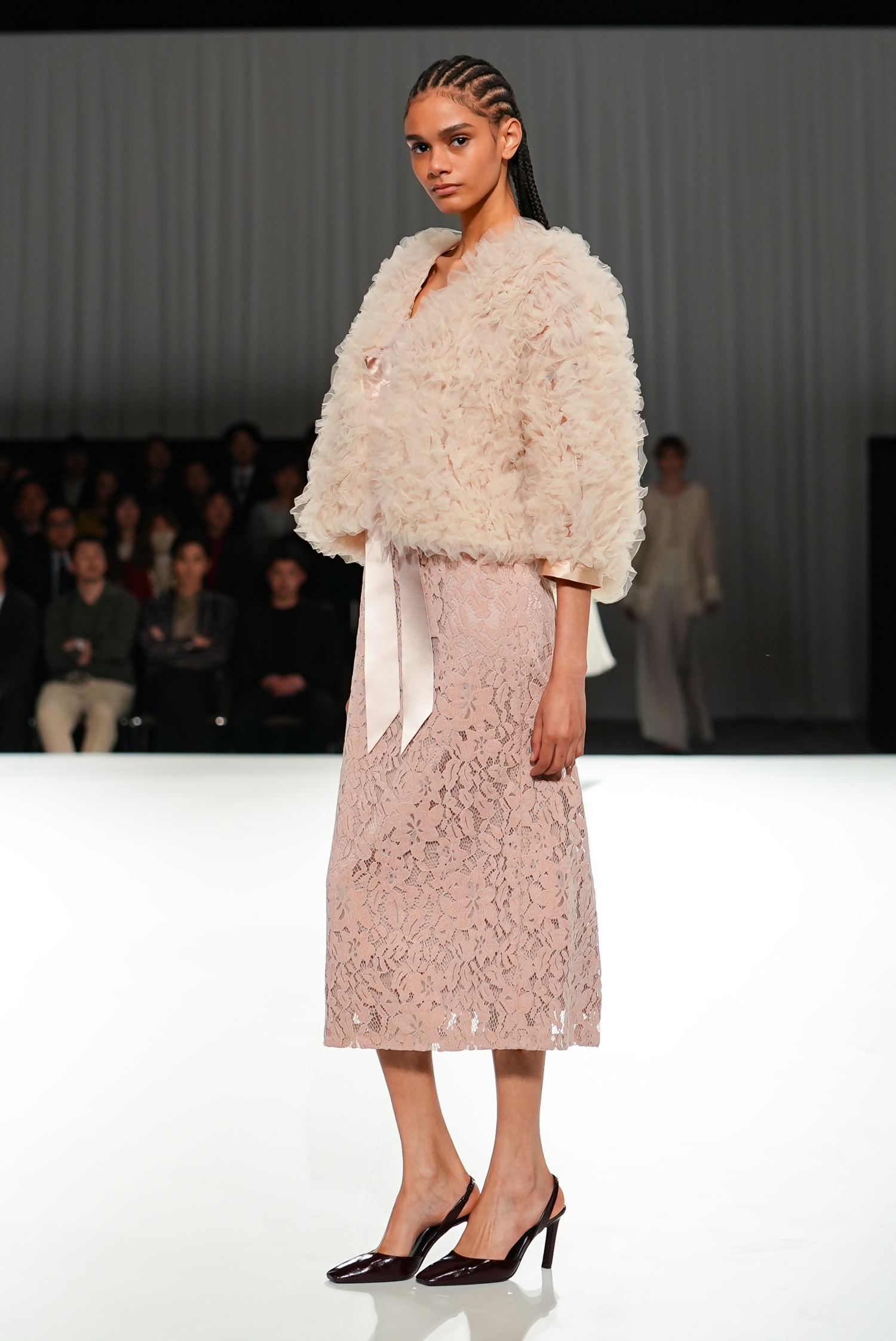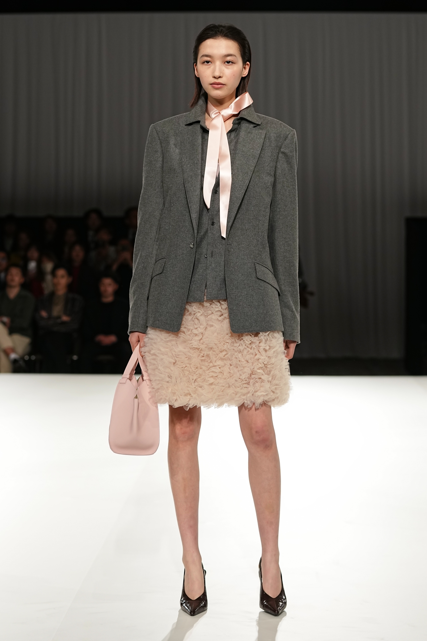 モノトーンを軸に展開されました。奥行きを生む繊細な素材使いが重なり、豊かな表情を描き出します。ロマンティックなフリルチュールは軽やかな動きを生み、空気をはらむような柔らかさを演出。一方で、端正なテーラードジャケットは構築的なシルエットで身体のラインを引き締め、内に秘めた強さを引き出しています。