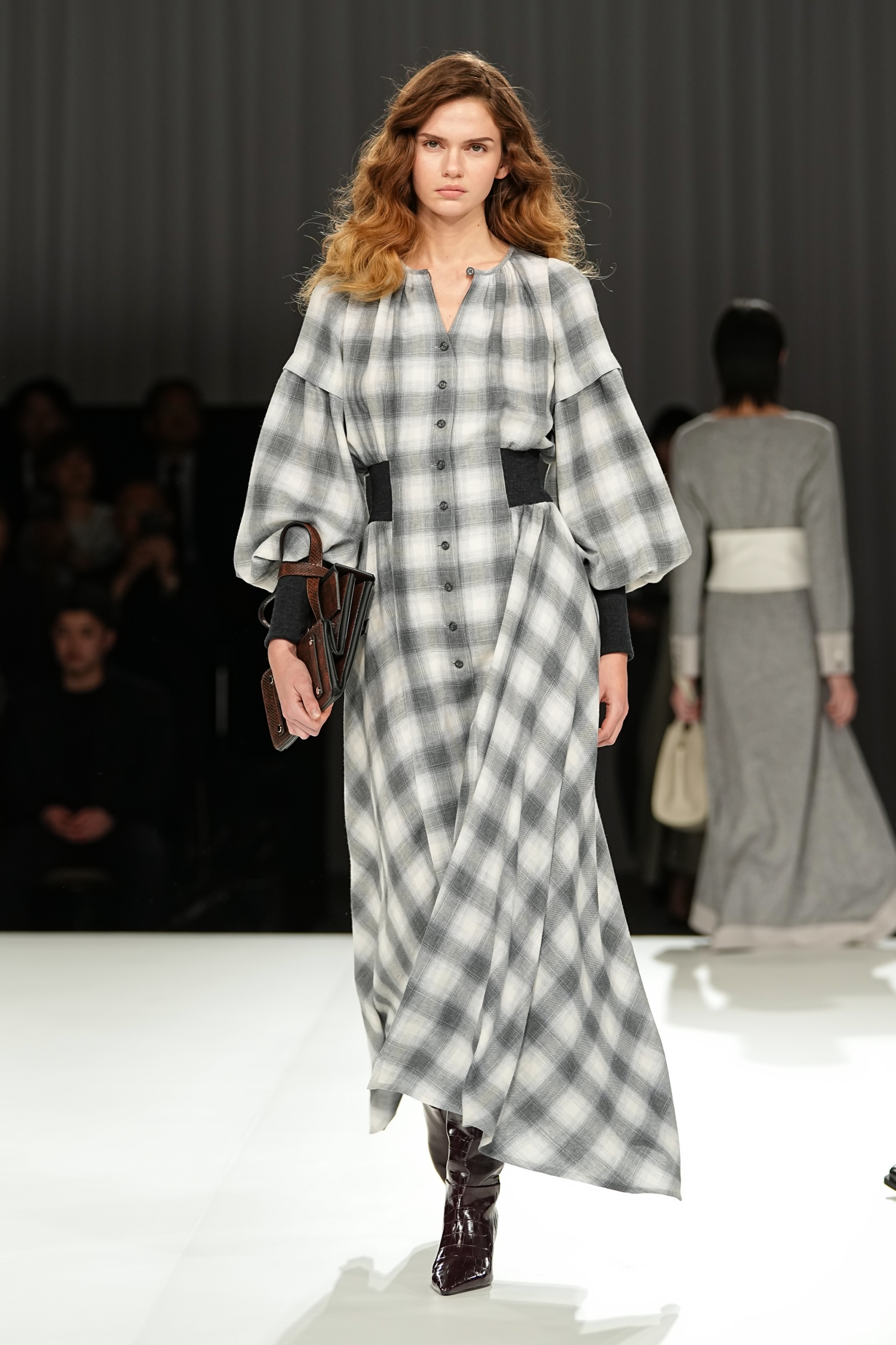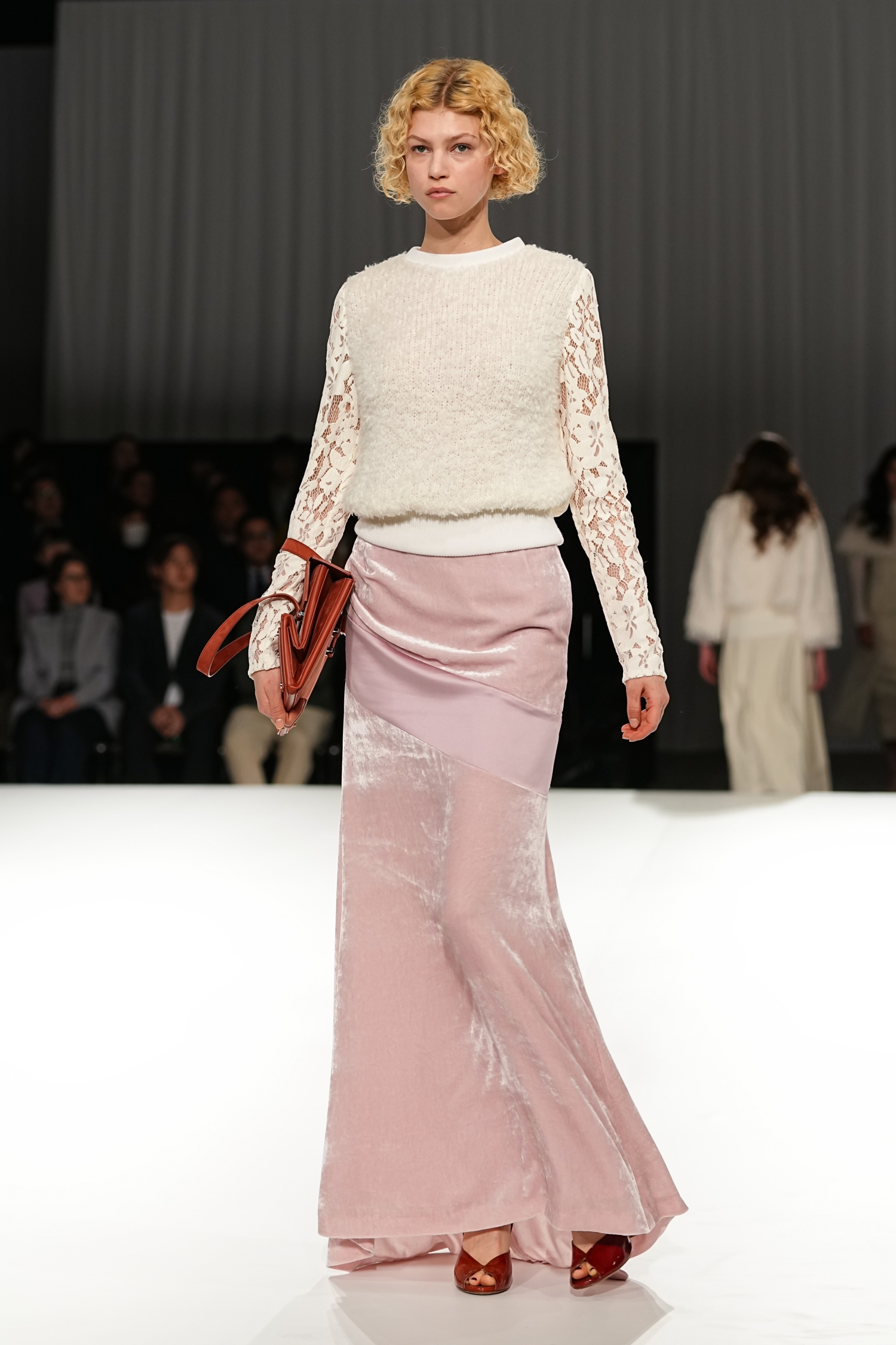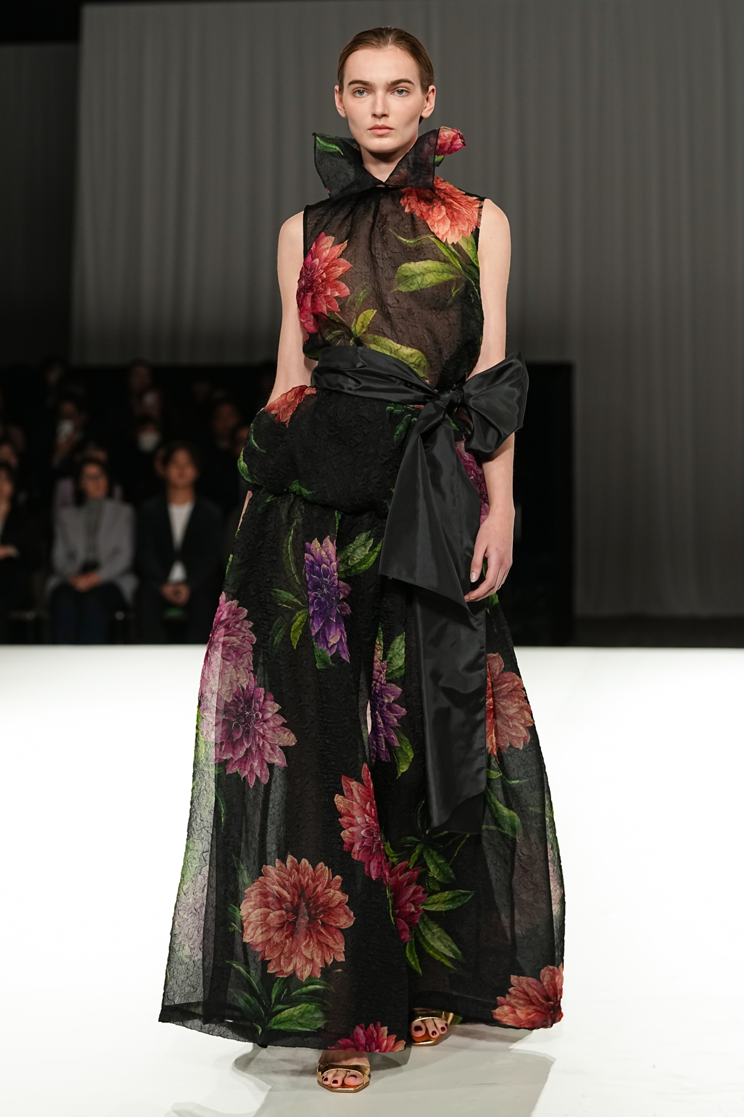 モノトーンを軸に展開されました。奥行きを生む繊細な素材使いが重なり、豊かな表情を描き出します。ロマンティックなフリルチュールは軽やかな動きを生み、空気をはらむような柔らかさを演出。一方で、端正なテーラードジャケットは構築的なシルエットで身体のラインを引き締め、内に秘めた強さを引き出しています。