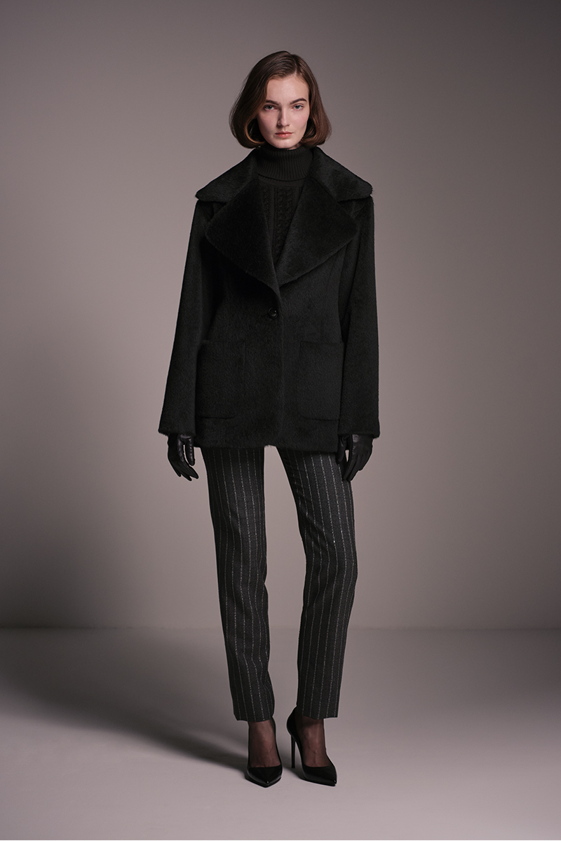 毛足の長いアルパカシャギーのショートコートからスタート。スパングルをあしらったストライプパンツや、ケーブル柄に編み上げたニットとの組み合わせにより、温かみと華やかさが共存するスタイルを提案。表面変化のあるウールクレープのセットアップや、リングツイードのAラインコートなど、テクスチャーの妙も際立ちます。