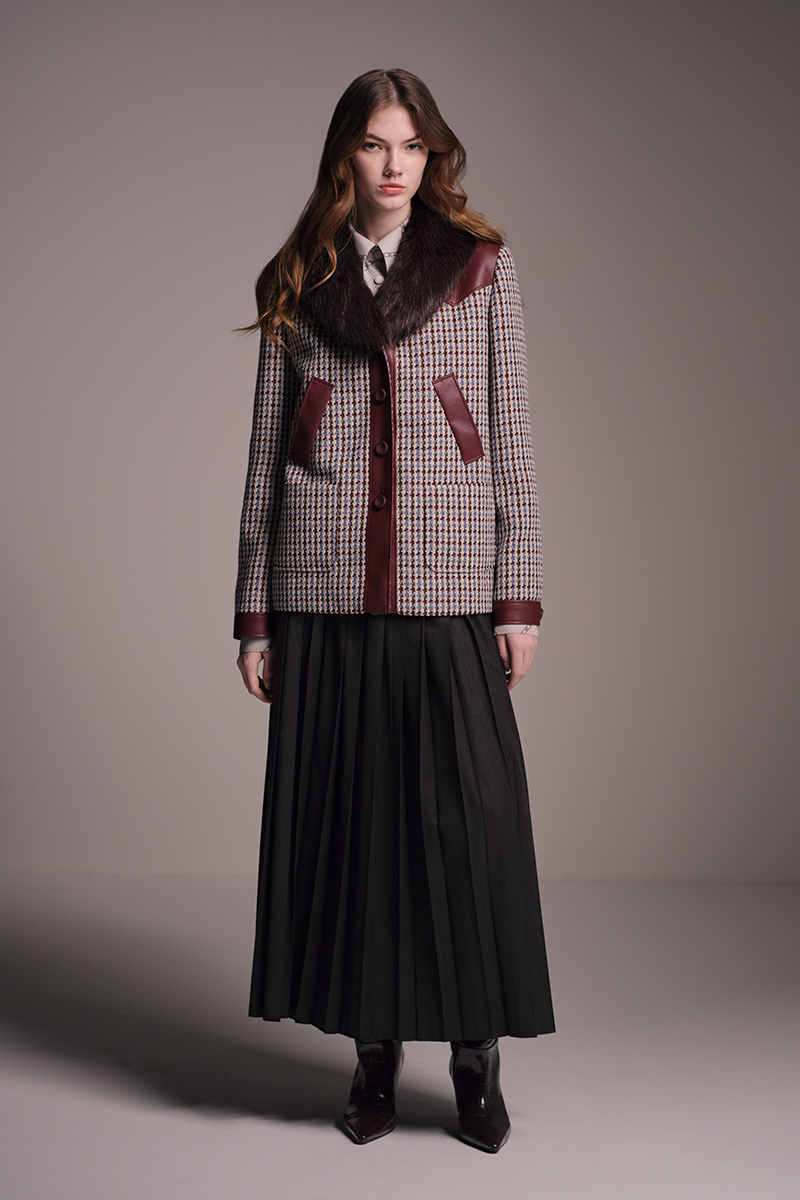 ヴィーガンレザー、ヴィーガンファーなど、サステナブルな素材も採用。チェック柄ジャケットにチェーンプリントのブラウスやプリーツスカートを合わせたスタイルは、クラシックと今のバランスが冴えています。