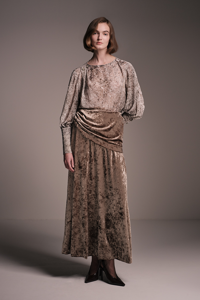 後半は、よりドレッシーな表現で、オパールプリントやベルベット、リバーレース、3Dジャカードなどを駆使し、光沢や透け感、立体感を巧みに重ね合わせたスタイルに。グリッタープリントやスパングルの輝きが加わり、動きに合わせて表情を変える華やかなイブニングスタイルを送り出しました。