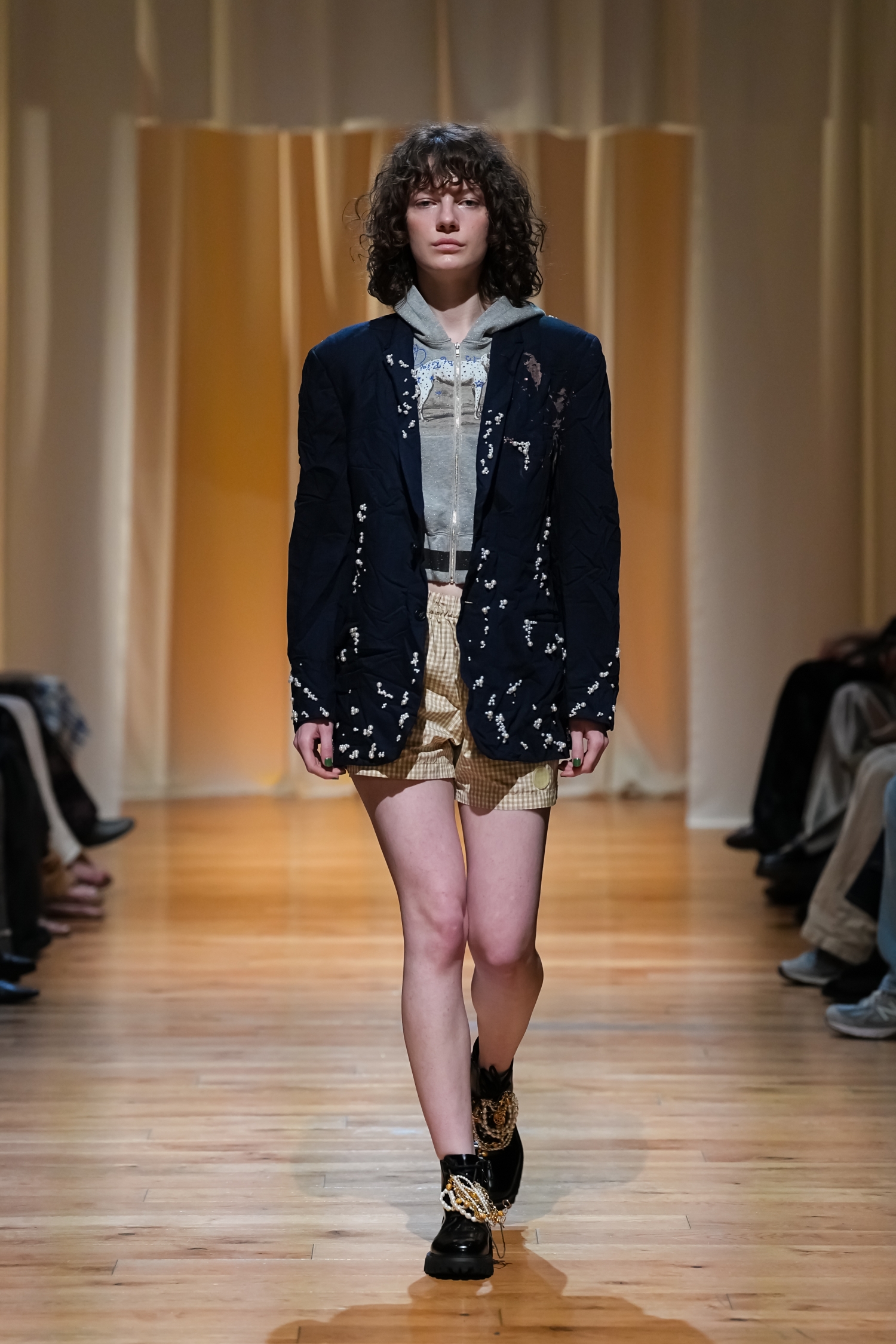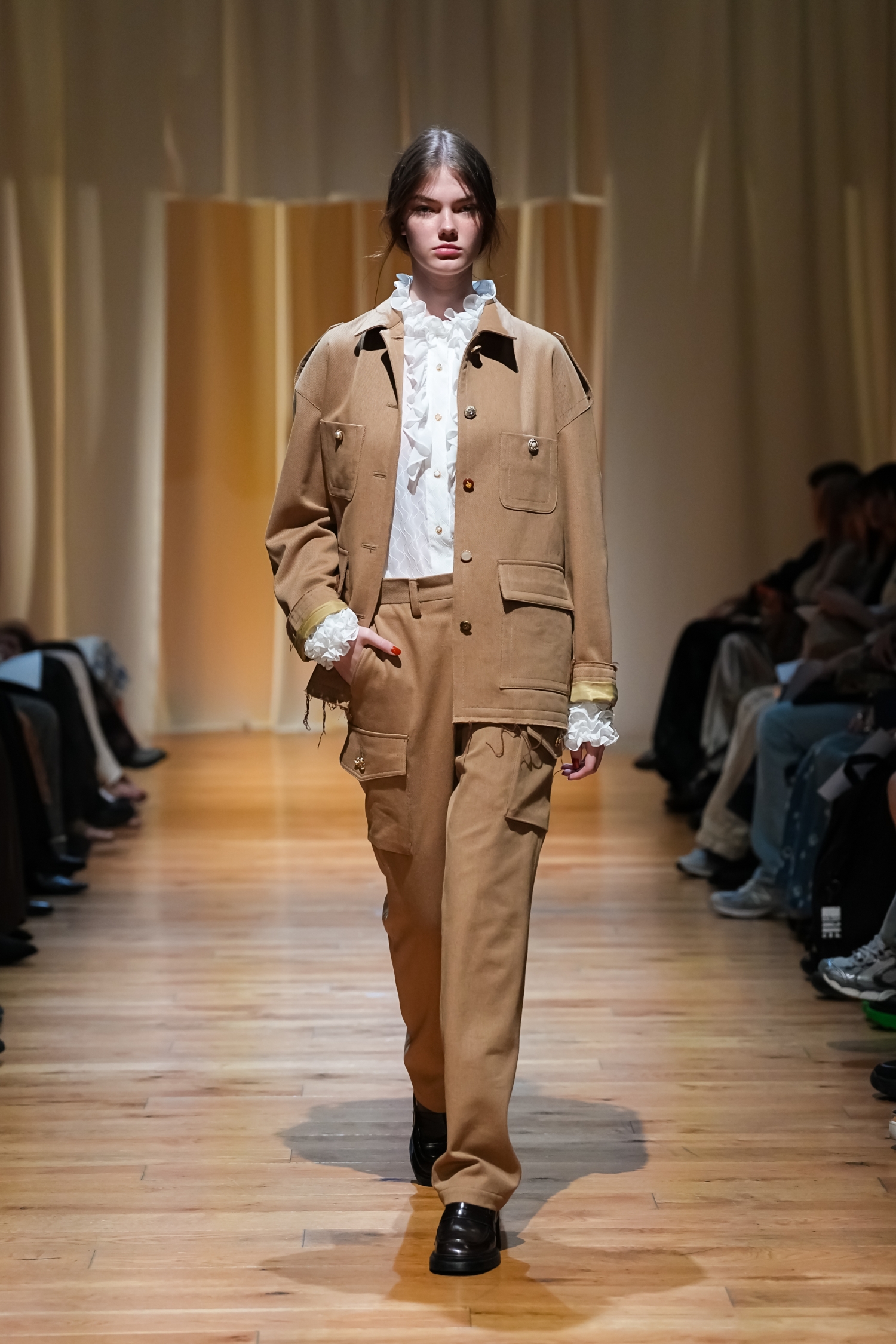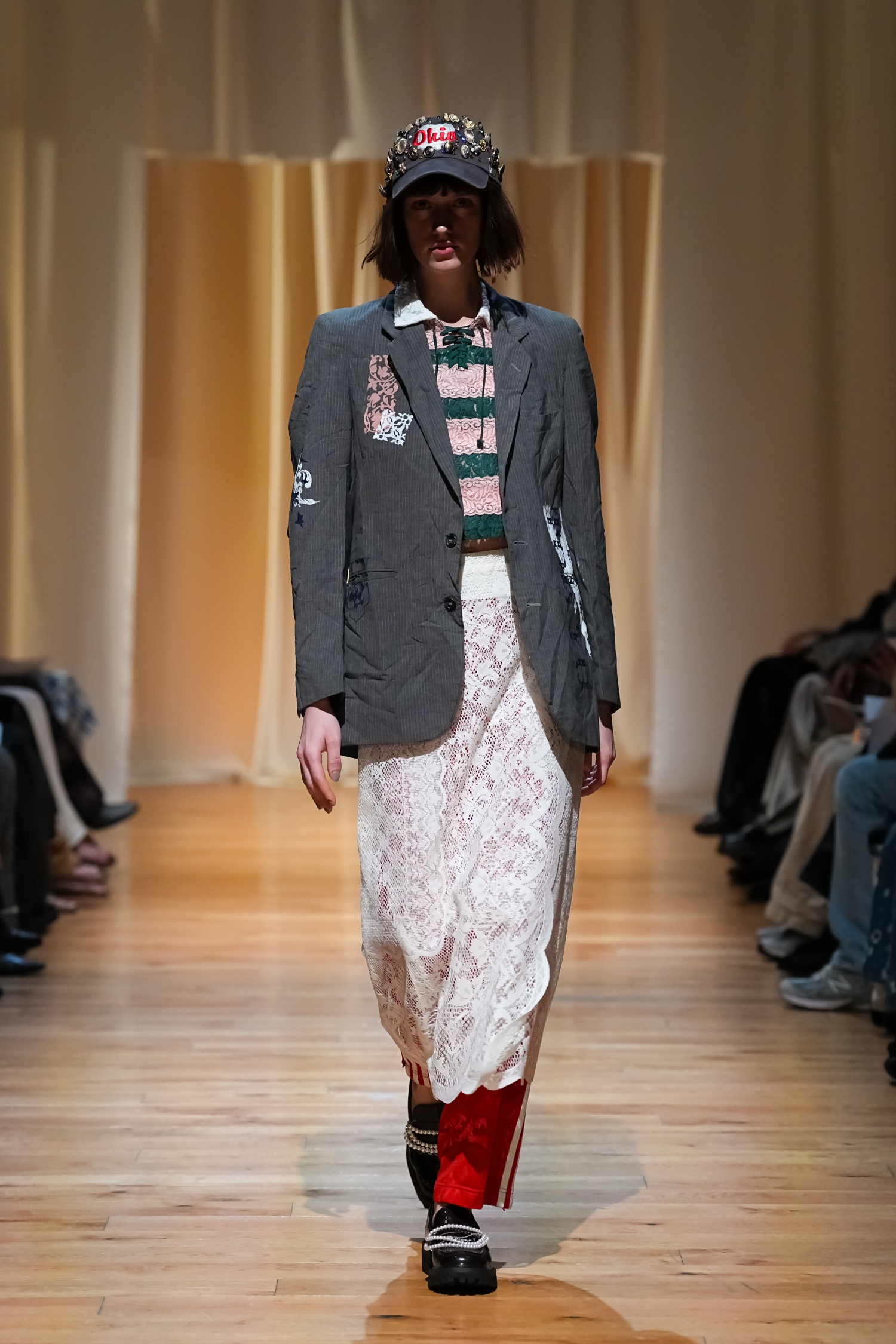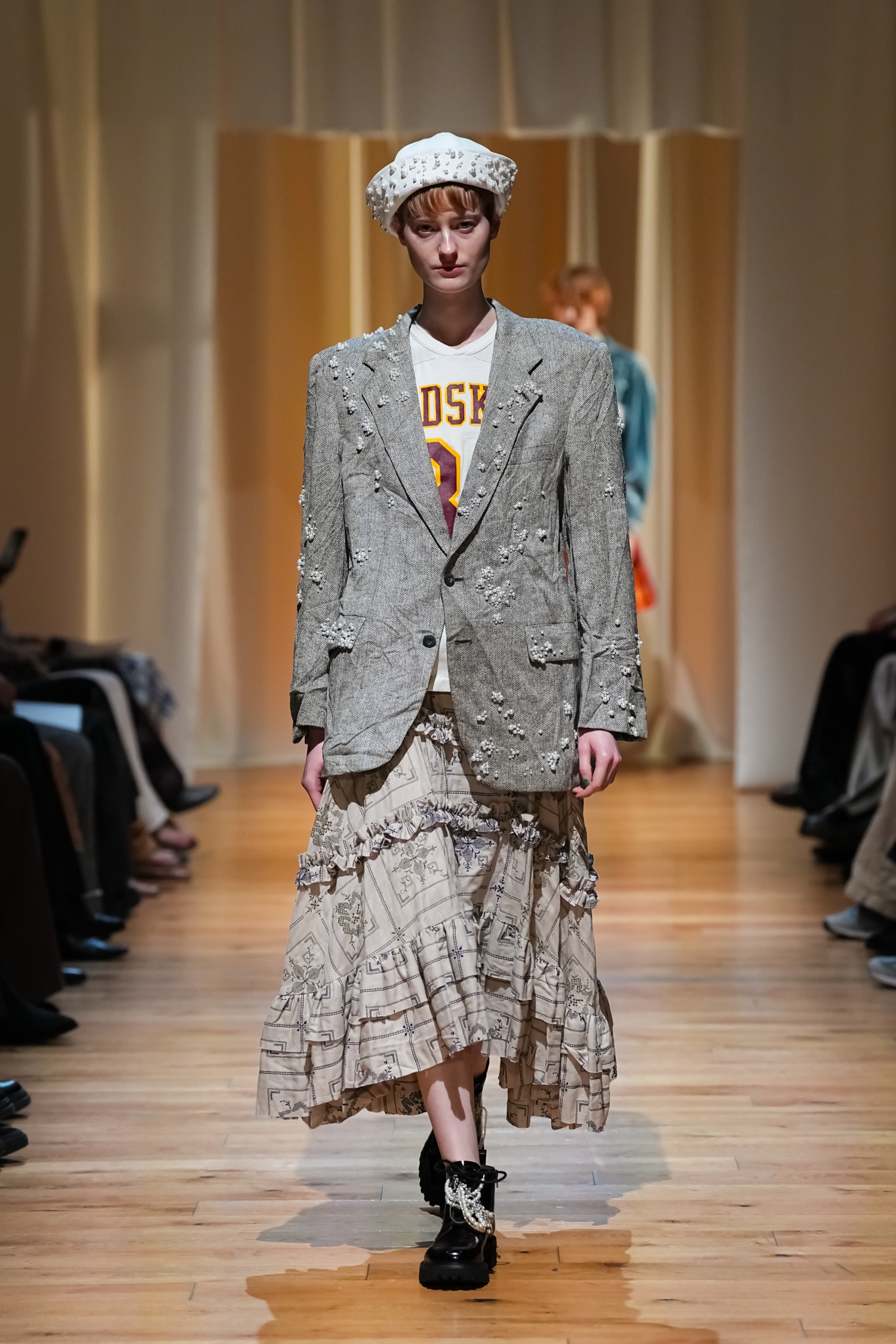 ヴィンテージ感を帯びた柔らかな空気感が漂います。パールモチーフをちりばめた装飾や、あえてシワを残したテクスチャー、無造作っぽく重ねたレイヤードによって、作り込みすぎない自然体テイストを表現しました。一方で、スポーティーやユニフォームの要素をミックスすることで、これまでよりもカジュアルで軽やかな表情にアップデートされています。