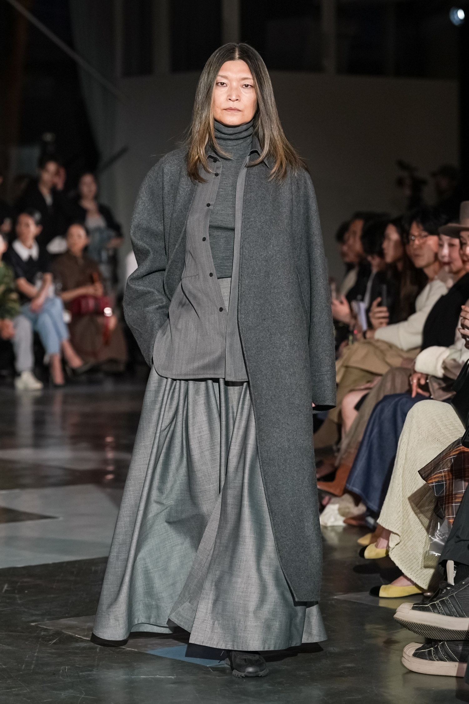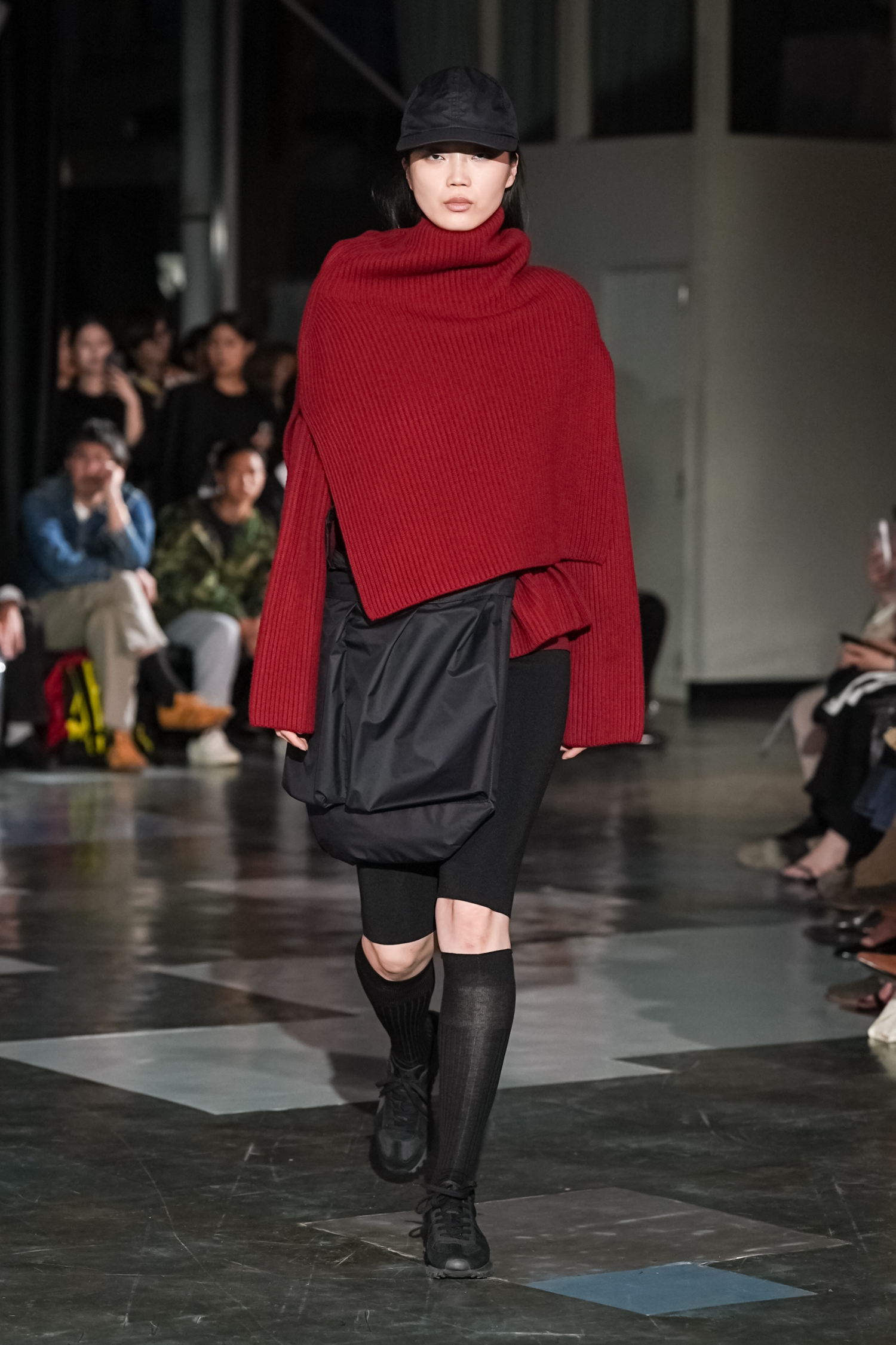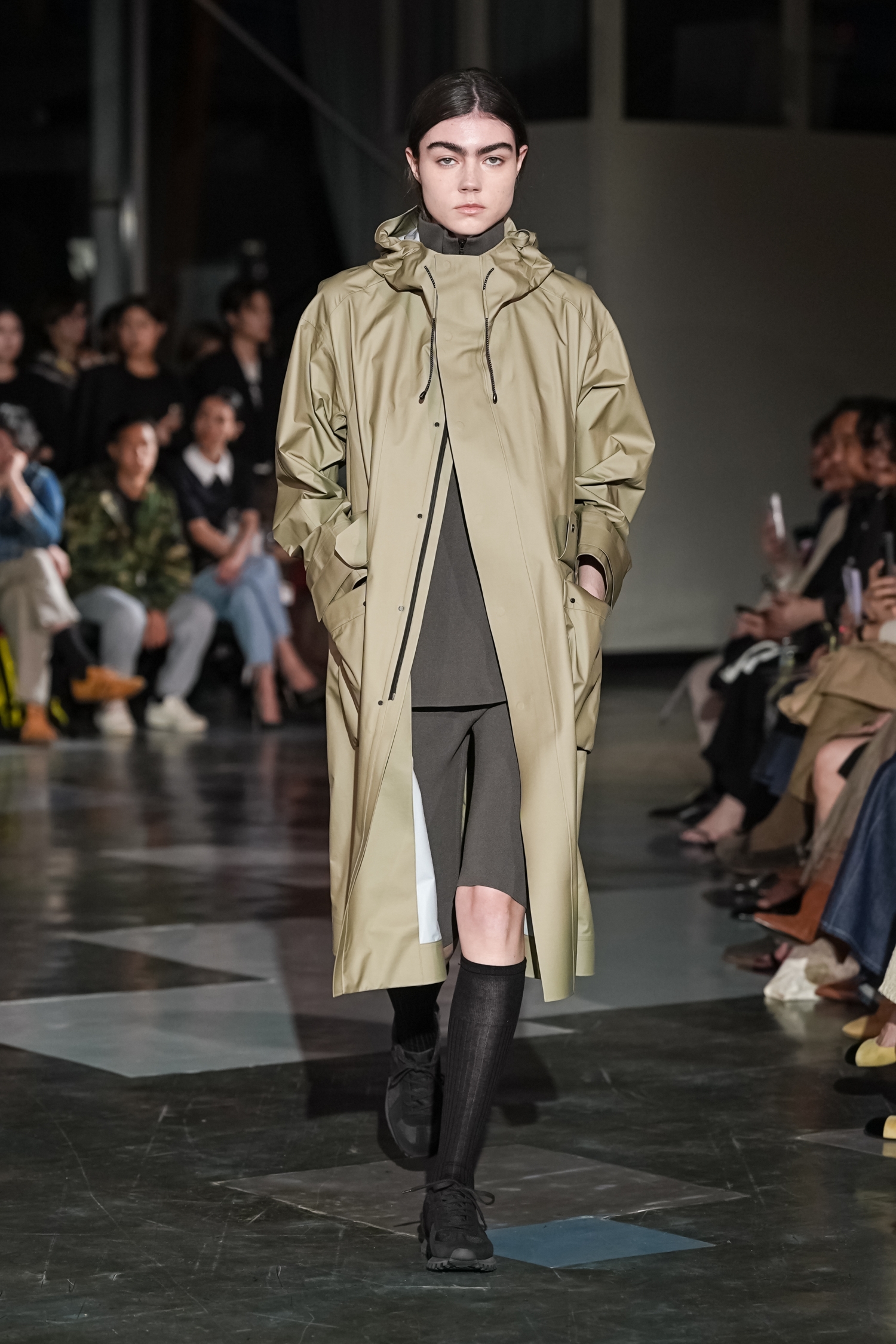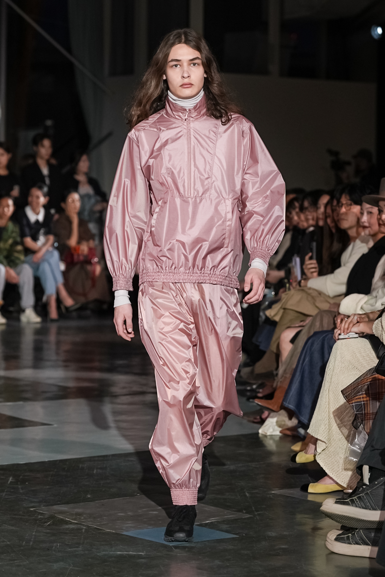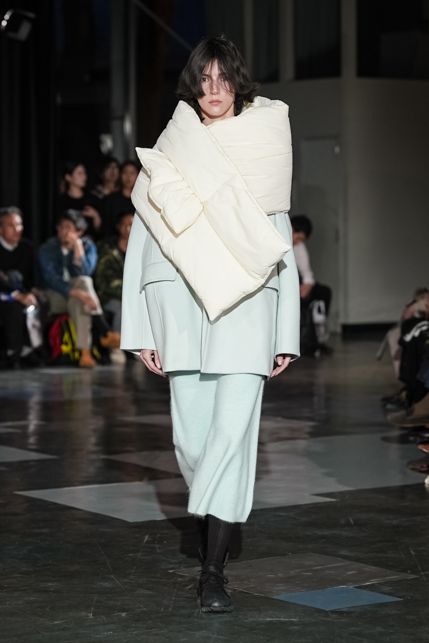 シルエットにも特徴があります。身体のラインをなぞるのではなく、空気をはらむように設計されたフォルムは、動くたびに表情を変え、軽やかな存在感を放ちます。ジェンダーに縛られないニュートラルなシルエットでありながら、どこか優雅さを帯びるのは、素材選びとパターンの好バランスゆえ。機能性をベースにしながらも、あくまで「装う楽しさ」を提案している点が印象的でした。