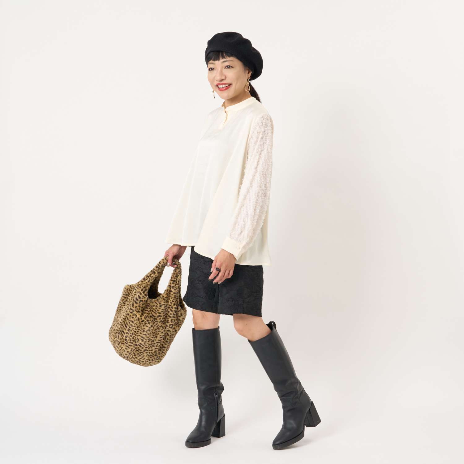 艶めく光沢と立体感が魅了する異素材コンビのハーモニー。スポッと被るだけで上品な装いに。