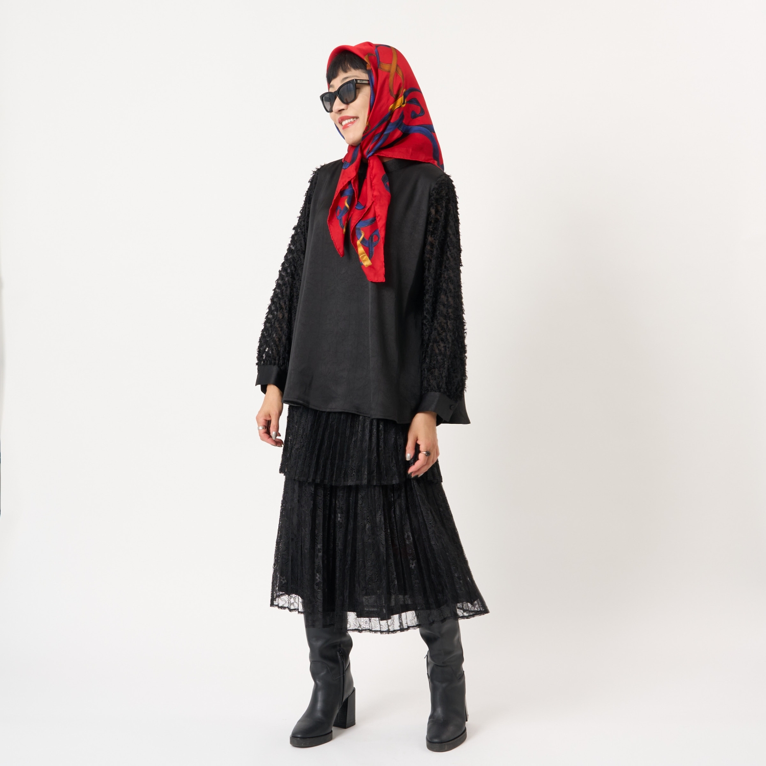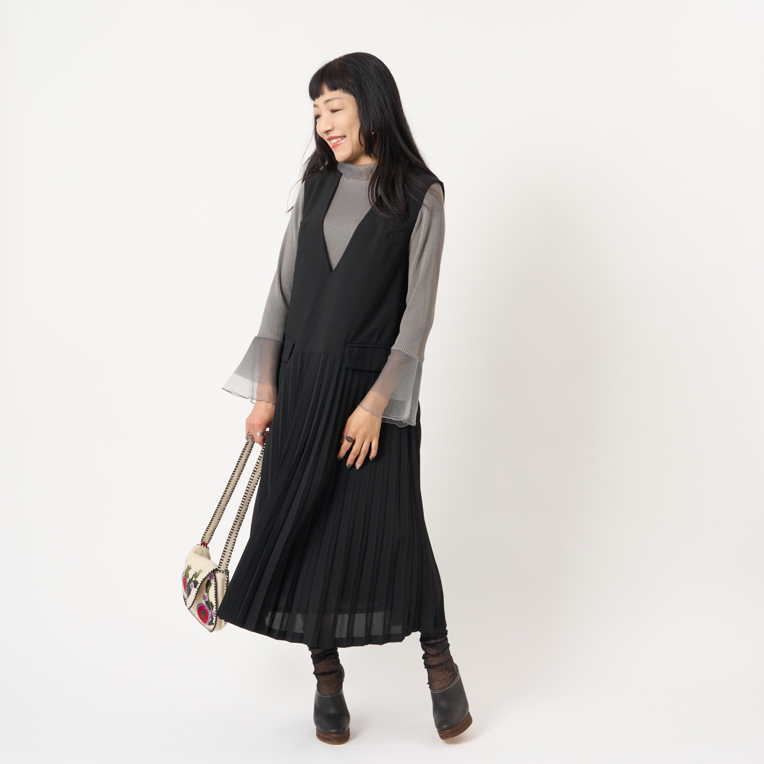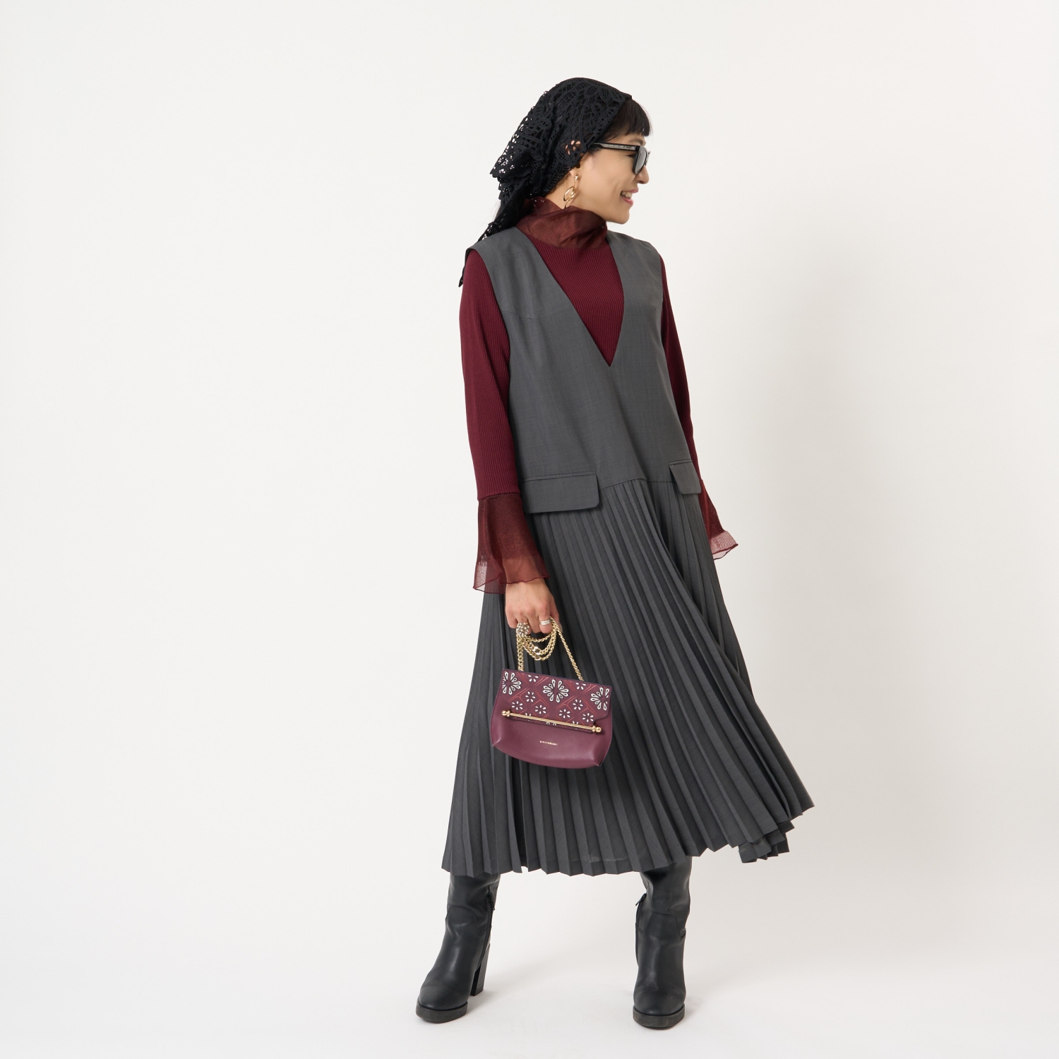 ・スカート部分のアコーディオンプリーツが、歩くたびに優雅に揺れ、大人女性の品格を演出。