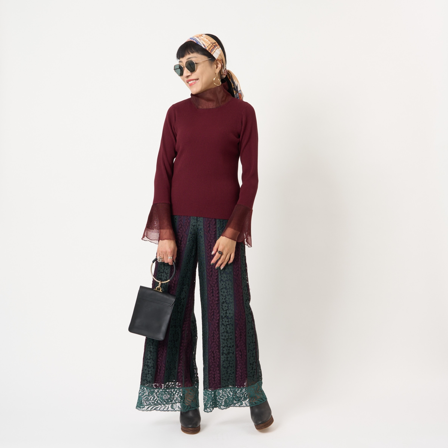・アウターの袖口からベルスリーブをのぞかせると、トレンド感のあるフェミニンな異素材ミックスコーデを楽しめます。