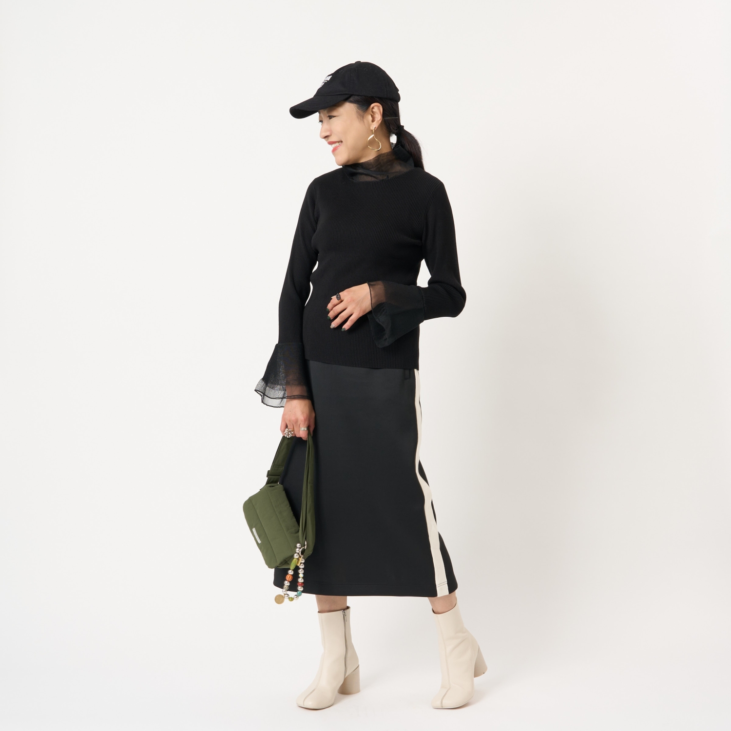ボディーラインを拾いにくい洗練シルエット。スポーティーな配色ラインで大人のエレガントさを演出。