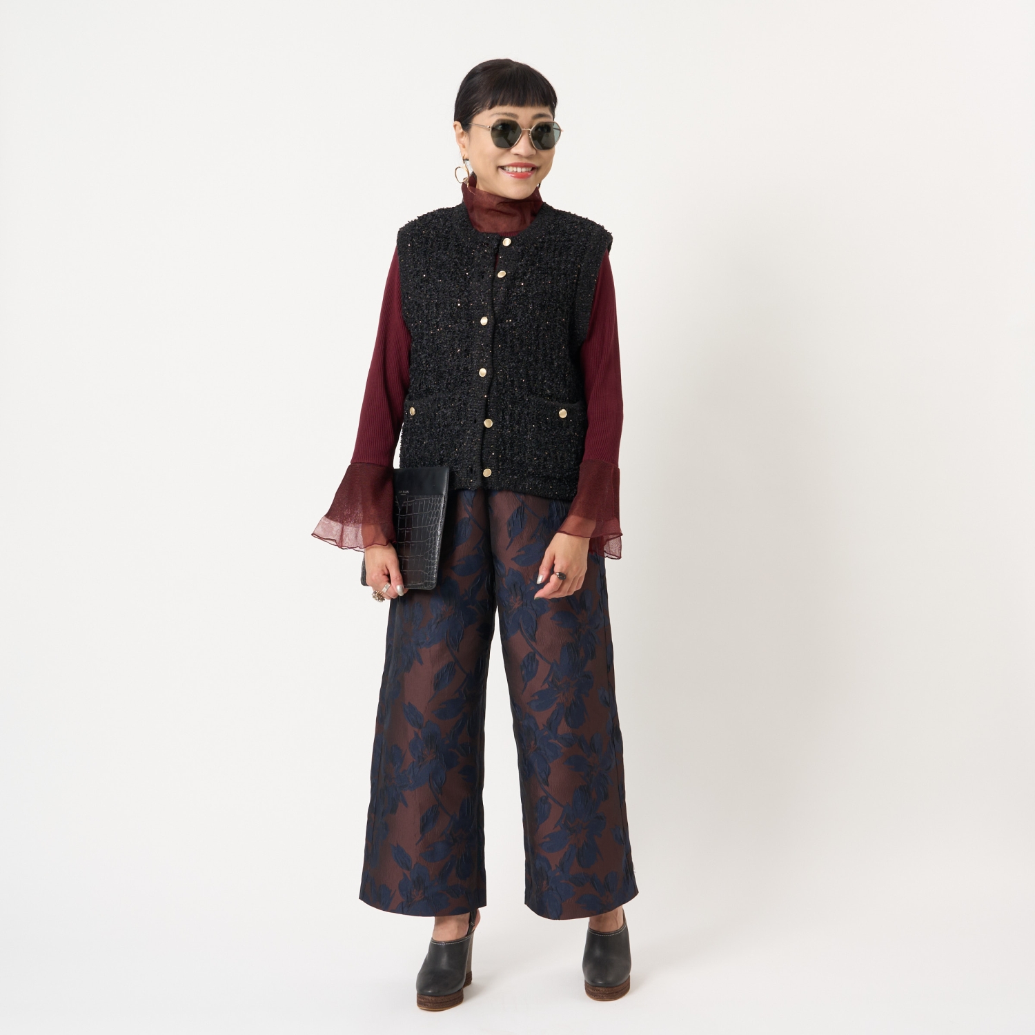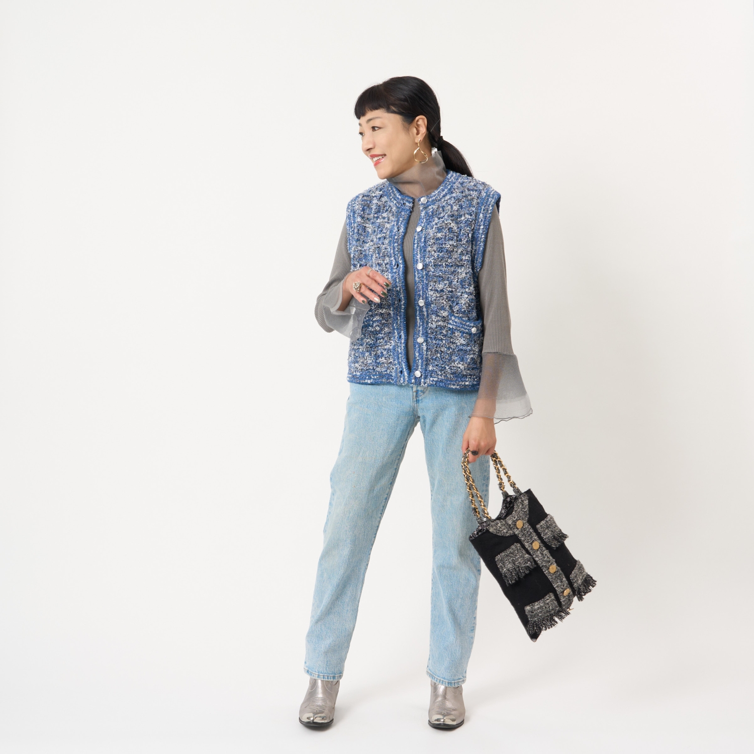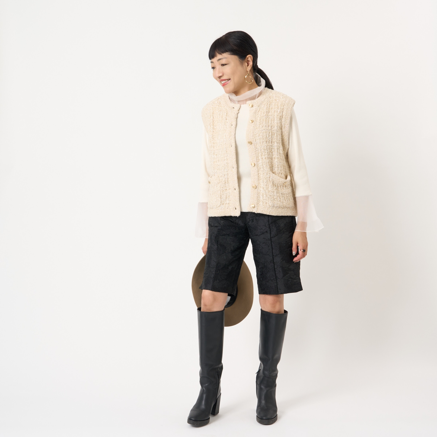 レトロとモダンが交差し、上質な装いを演出する、3種類の糸で表現したツイード調ニットジレ。