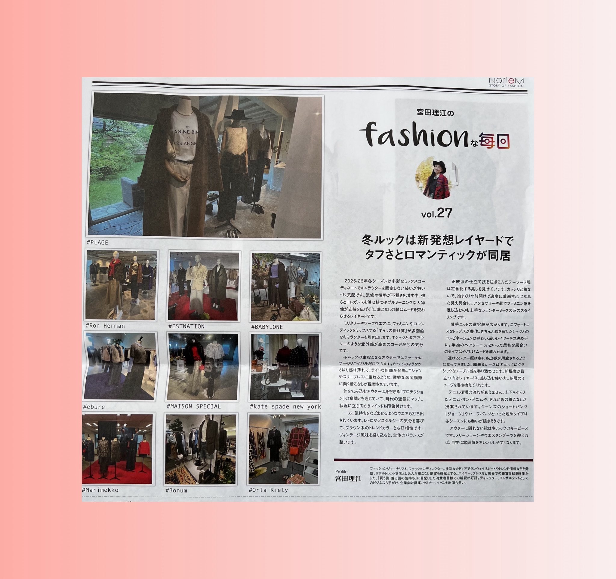マツオインターナショナルが発行するタブロイド紙『Noriem (ノリエム )』(冬号)の連載「fashionな毎日」vol.27で、『2025年冬は新発想レーヤードで タフさとロマンティックが同居」を寄稿しました。