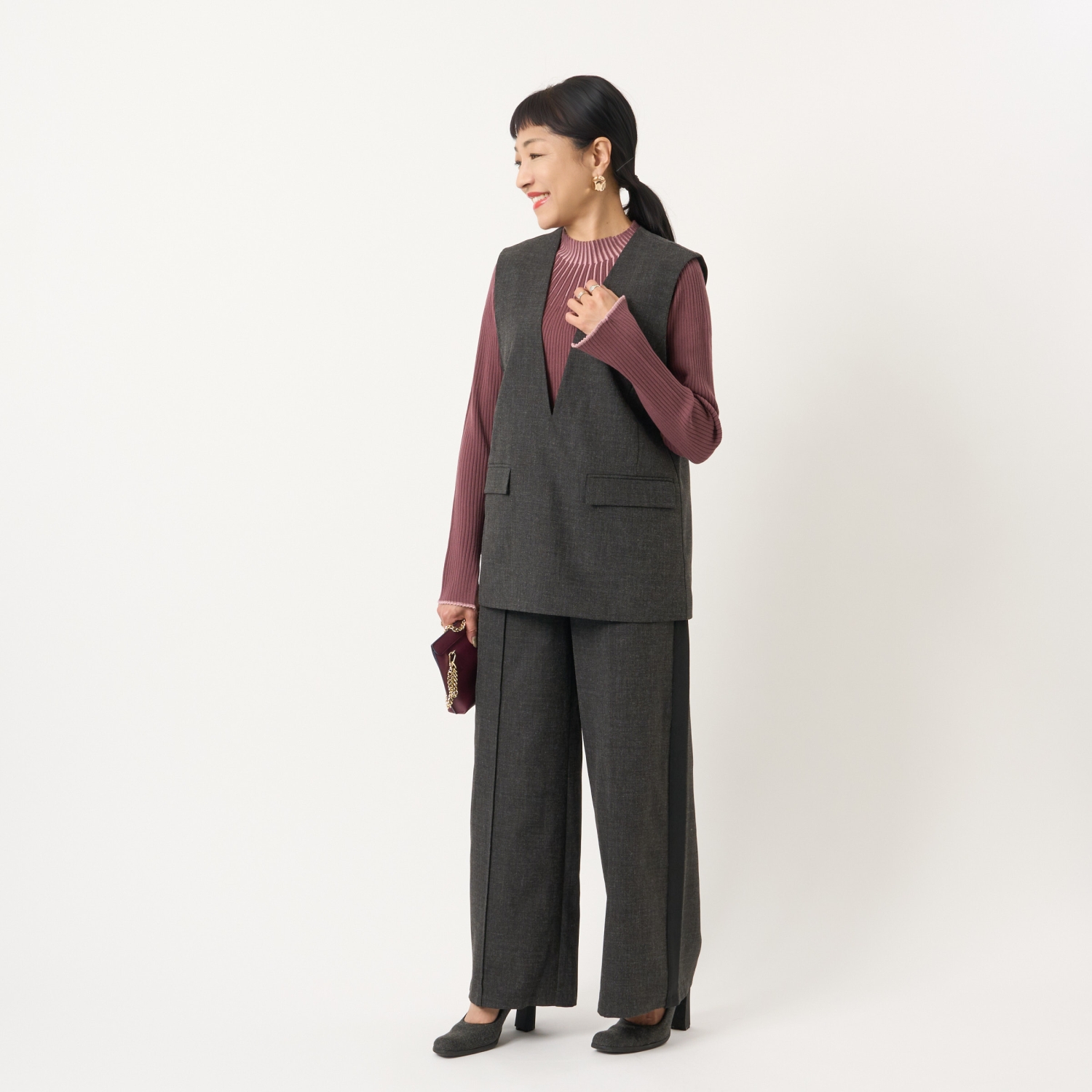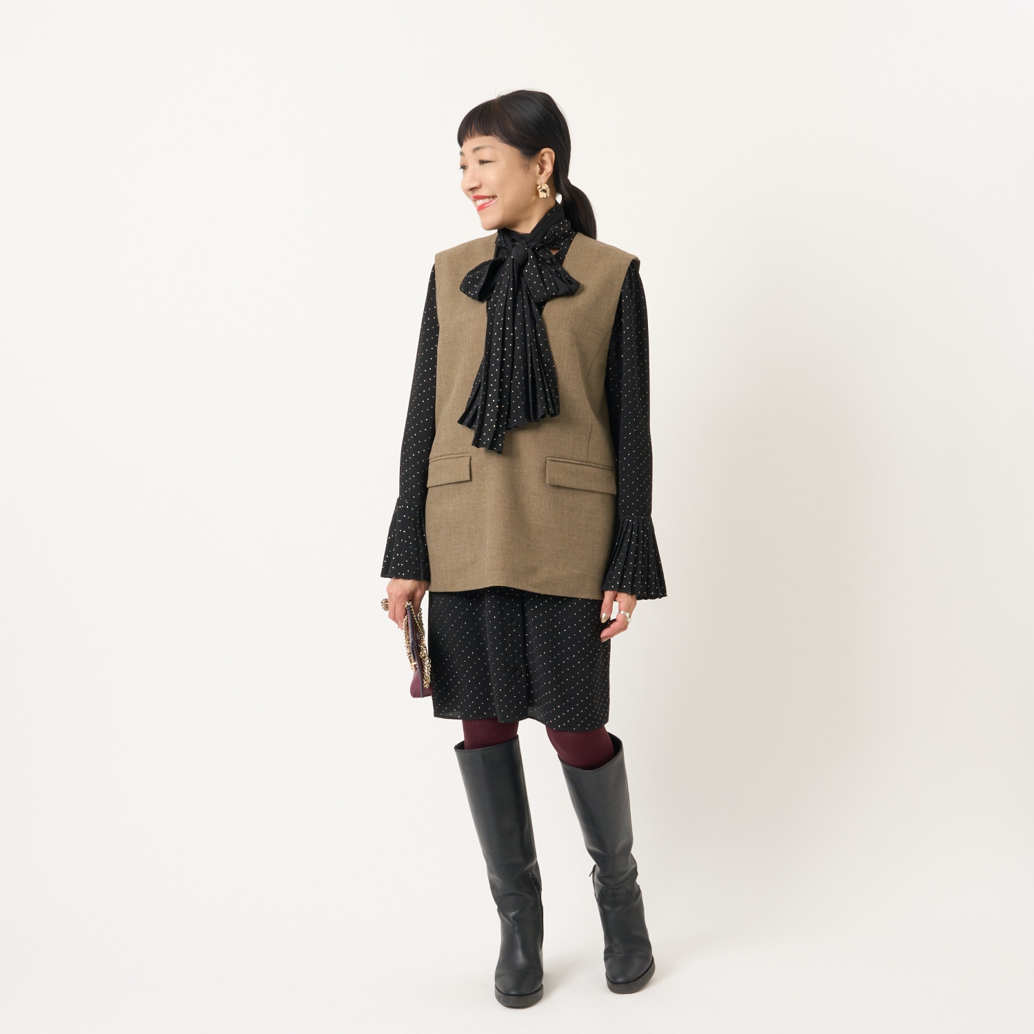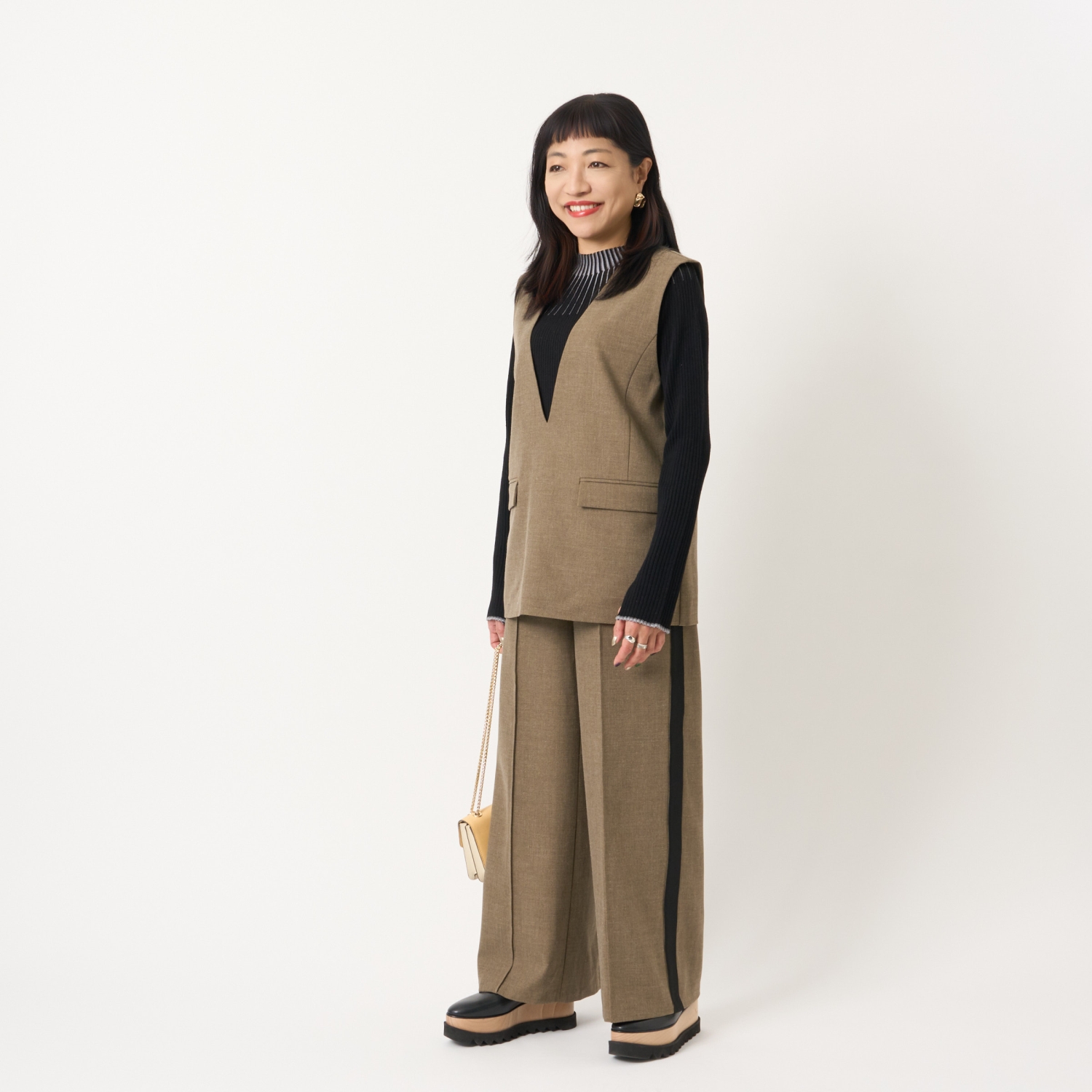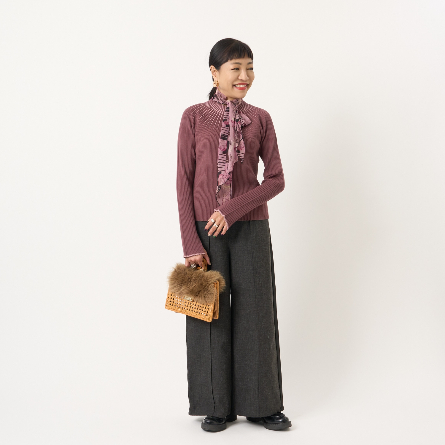・ハイネックやボウタイブラウス、シャツなどさまざまなトップスと好相性で、幅広いスタイリングが楽しめます。