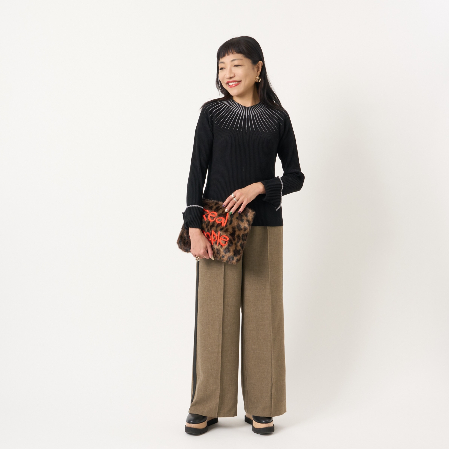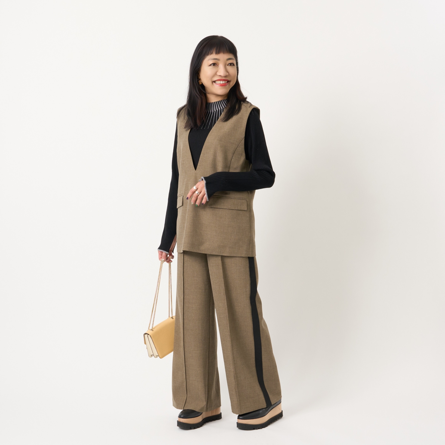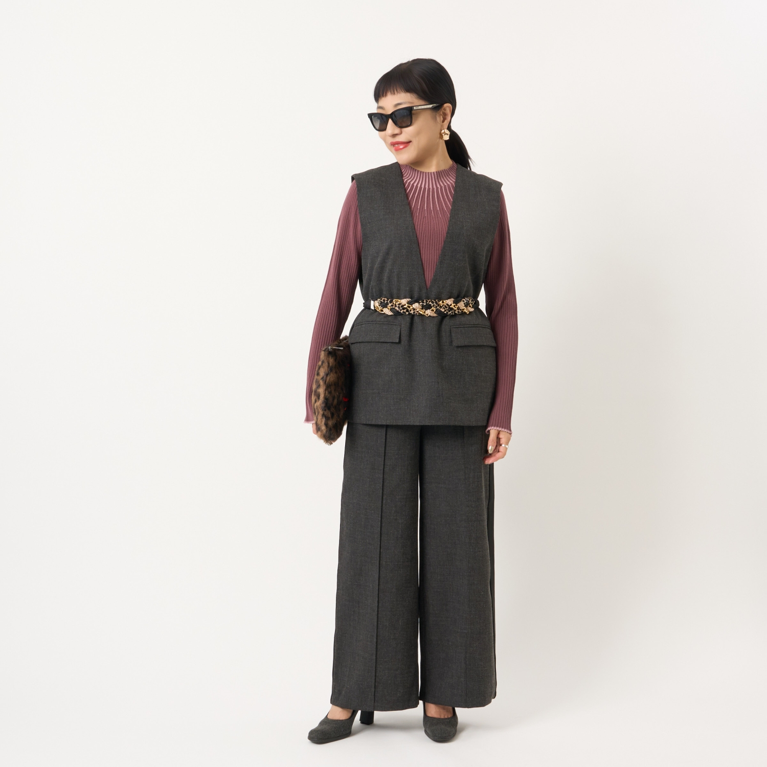 ・ハイネックやボウタイブラウス、シャツなどさまざまなトップスと好相性で、幅広いスタイリングが楽しめます。