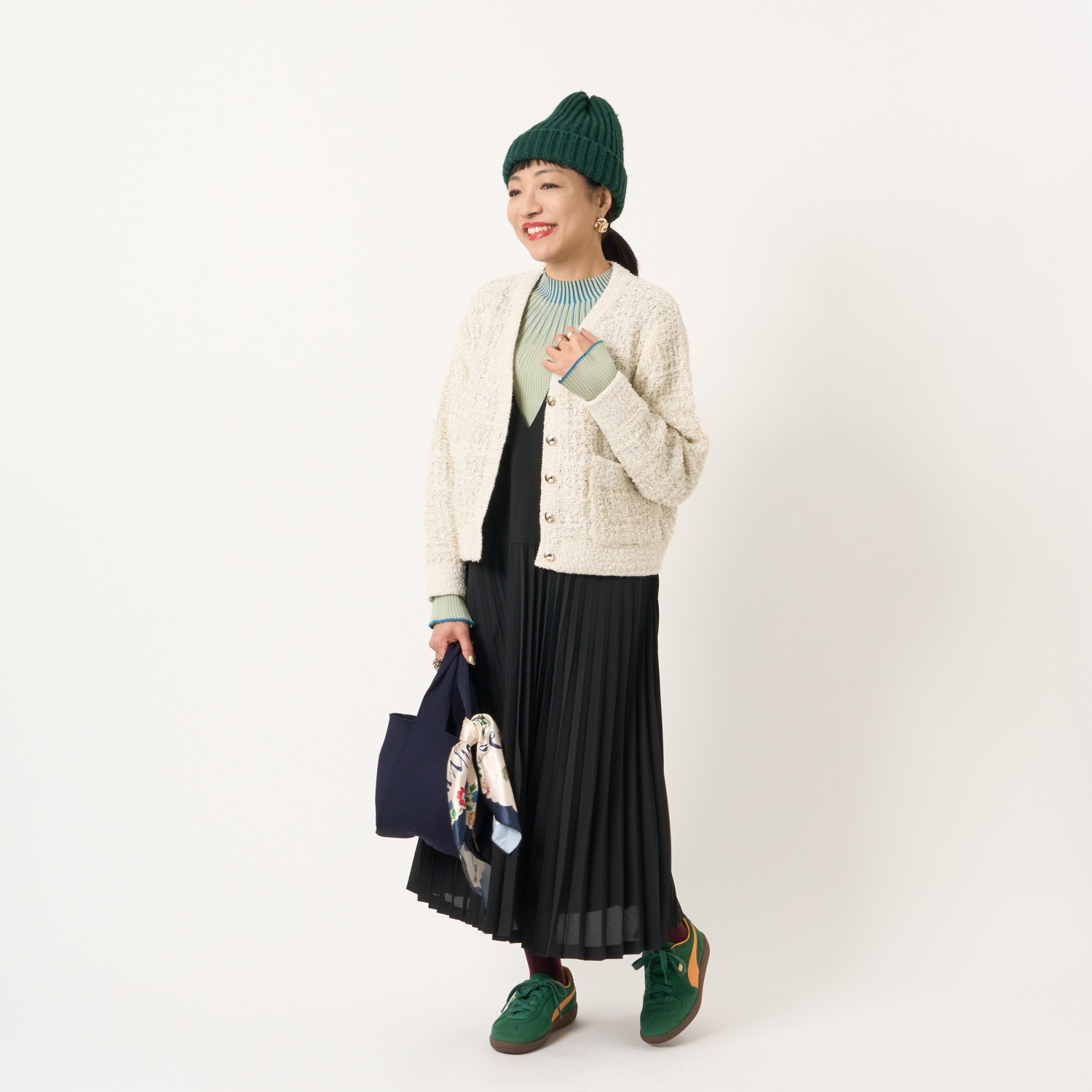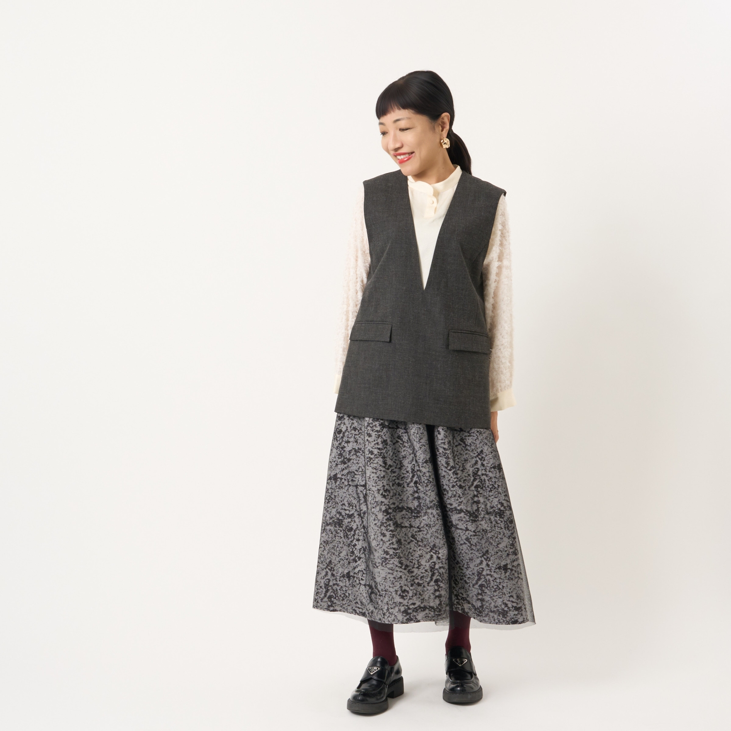 ・膝が隠れる丈感で、ローファーやブーツなど幅広いシューズとバランス良く合わせられます。