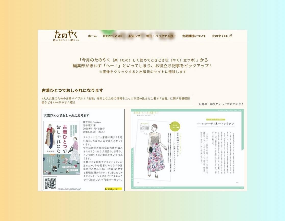 雑誌「たのやく」が拙著『古着ひとつでおしゃれになります』を取り上げてくださいました。