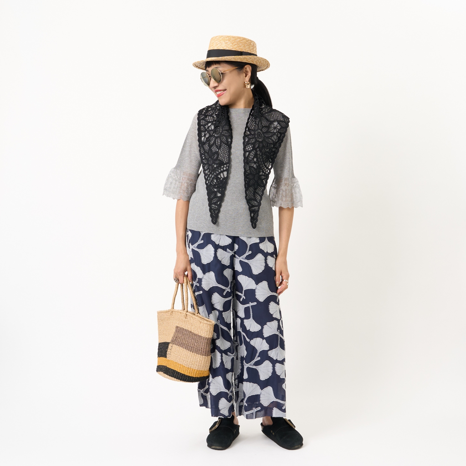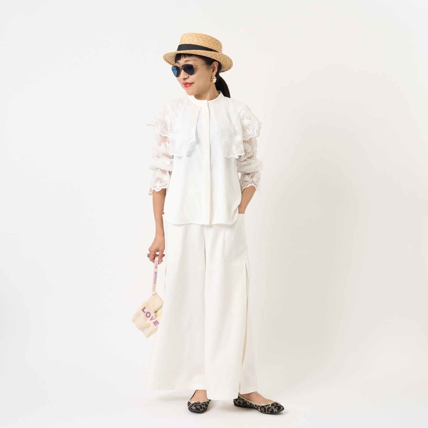 ・涼やかなボトムスに合わせる夏トップスは意外と難しいもの。コンパクトに見えながら、ほのかなゆとりを感じさせる絶妙なバランスです。