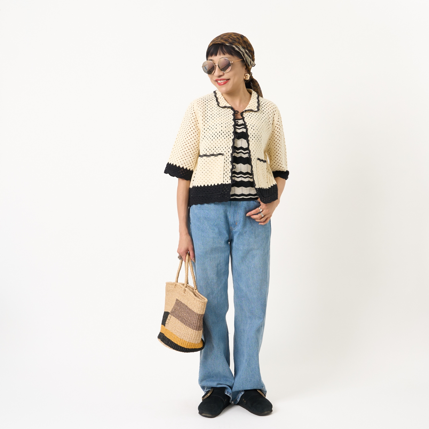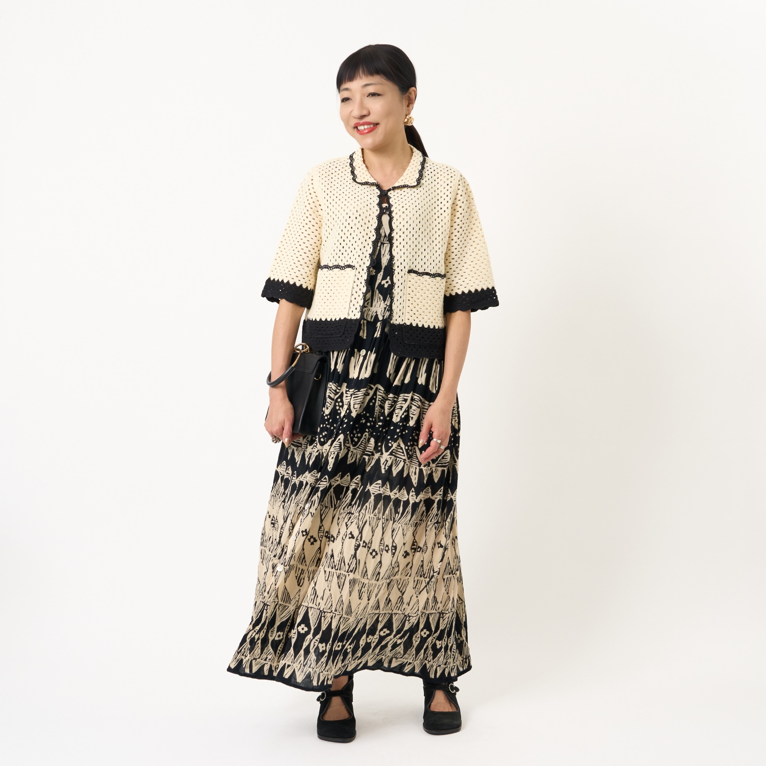 ・パッチワークのように編み地を切り替えたアートフルな表情。ほっこりに傾かない、大人のためのクラフト感です。